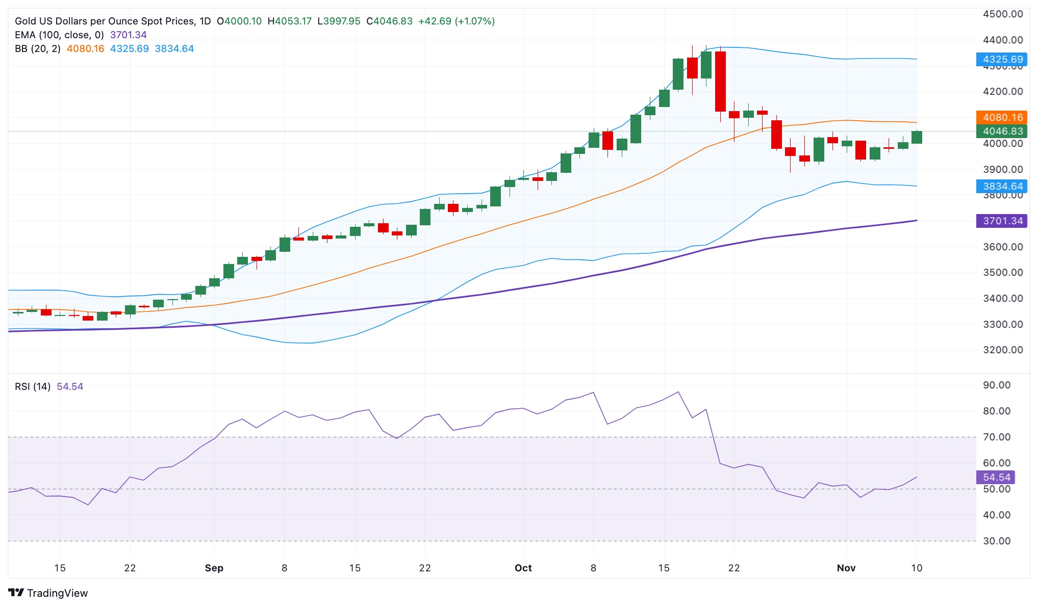 黄金价格(黄金/美元)在周一早盘欧洲交易时段上涨至 4050 美元以上。在美国经济前景不确定的情况下,这种贵金属小幅走高 标题:黄金因全球经济增长担忧而上涨,但对达成停摆协议的希望可能会限制其上涨空间