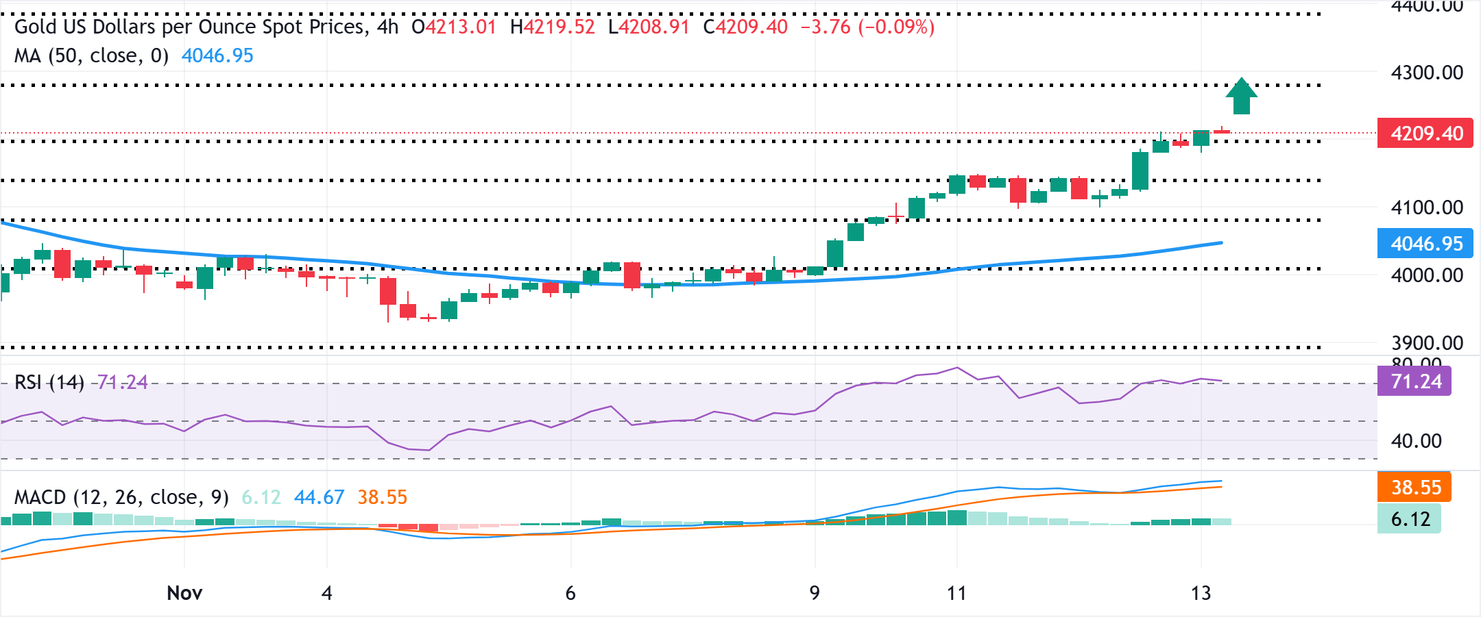 黄金(黄金/美元)在周四逆转了亚洲时段的小幅下跌,攀升至超过三周高点,约在4213美元区域 标题:金价触及三周高点,因鸽派美联储押注抵消美国政府重启的乐观情绪