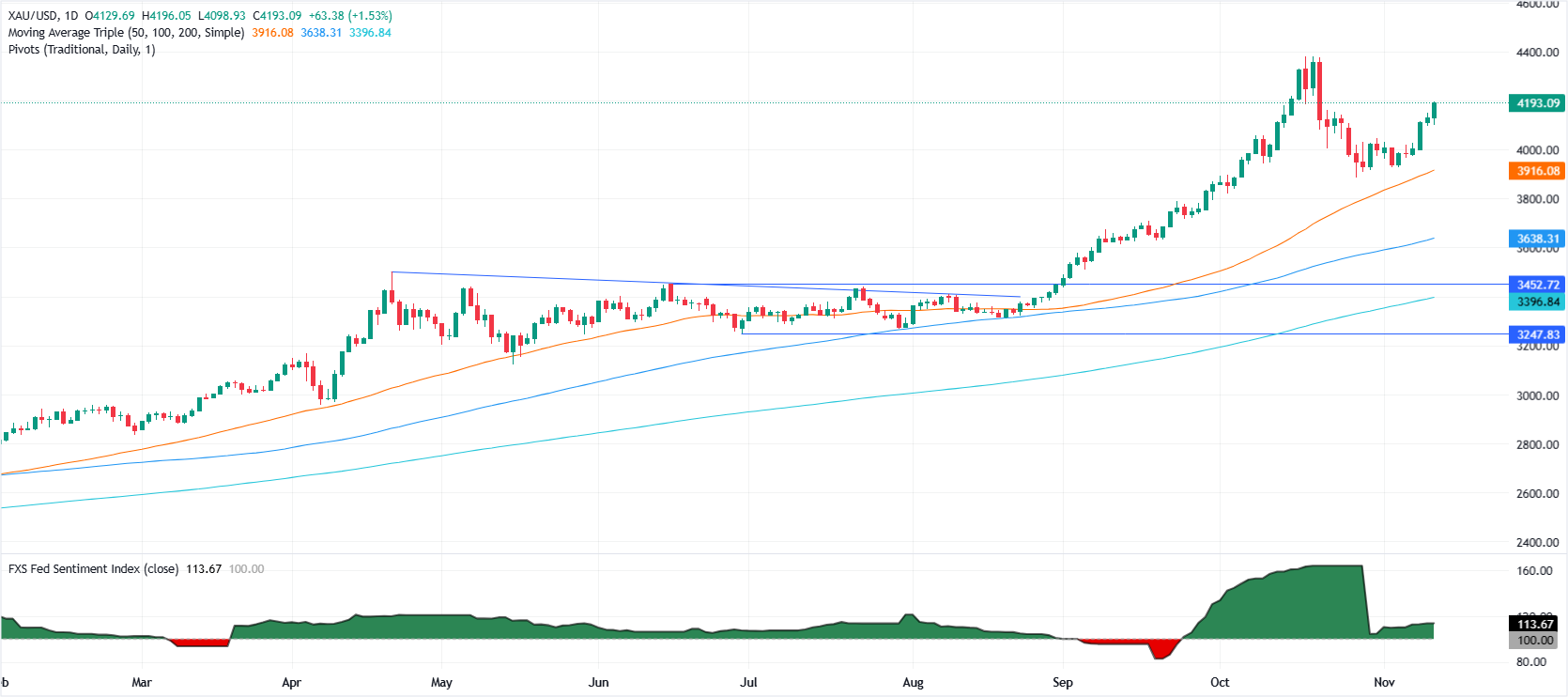 周三,黄金(黄金/美元)大幅上涨,突破4200美元关口,因美国国债收益率下滑,美元回吐早前的涨幅。尽管风险偏好改善,但在10月底跌至3886美元后,黄金仍然恢复了涨势,此前曾接近4400美元的历史高点 标题:黄金在美元疲软和收益率下跌的背景下测试4200美元,等待美国停摆投票