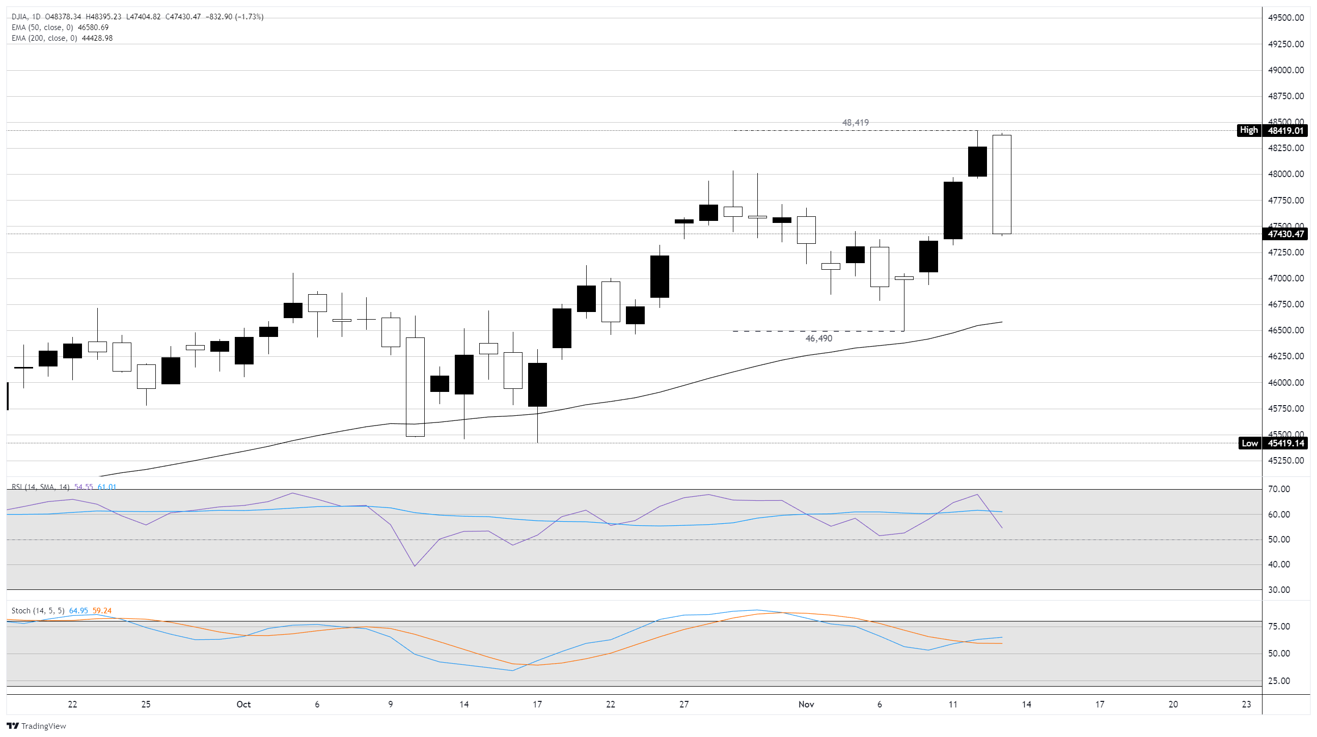 道琼斯工业平均指数(DJIA)在周四大幅回落,最低下跌约850点,远离周中市场交易时创下的历史高点 标题:道琼斯工业平均指数下跌850点,股票回落