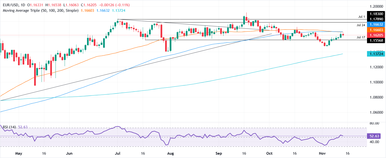 欧元/美元周五以0.10%的跌幅收盘,但本周以0.51%的涨幅结束,因为风险偏好在市场对美联储下个月暂停宽松周期的日益猜测中恶化。尽管如此,该货币对仍收于1.1600上方,为进一步上涨铺平了道路 标题:欧元/美元尽管因美联储降息预期削减而出现周度回调,仍紧守1.1600