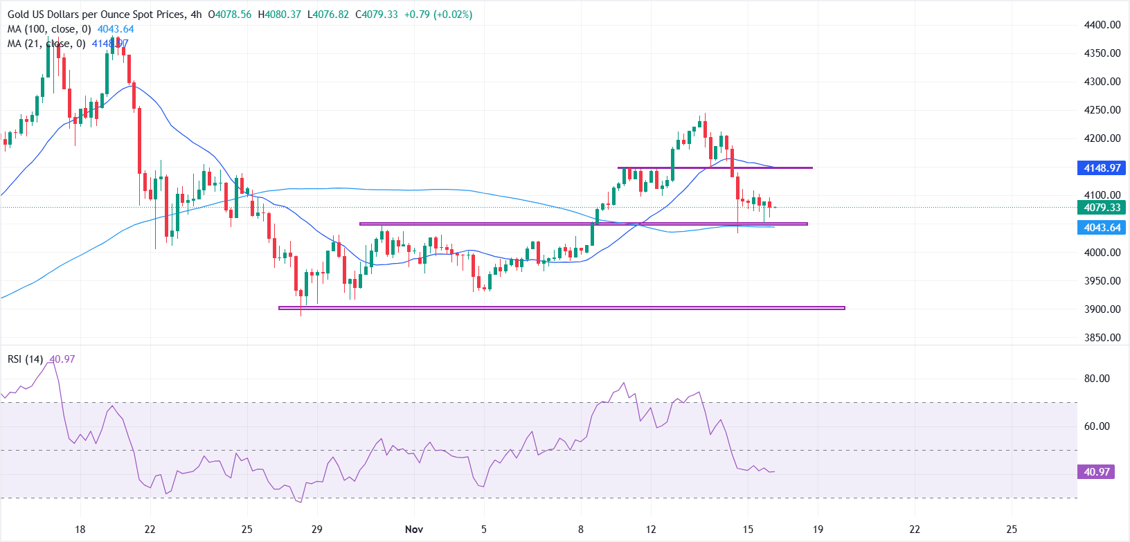 黄金(XAU/USD)在本周以低迷的姿态开局,在经历了上周突破三周高点后的两天下滑后,正在整固损失。截至发稿时,XAU/USD交易在约4075美元,涨幅受到更强美元(USD)和对美联储(Fed)12月降息预期减弱的限制。 标题:由于美元走强和美联储降息预期减弱,黄金价格表现平淡