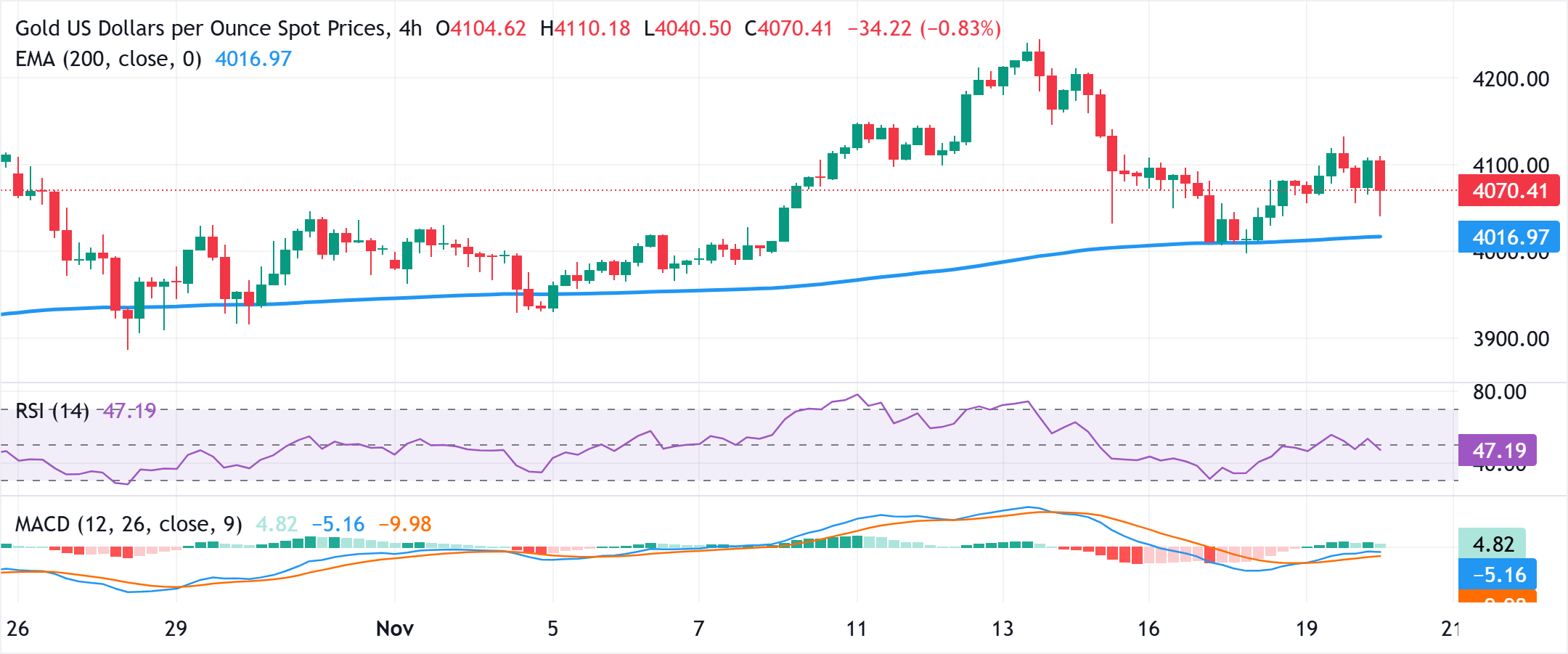 周四亚洲时段,黄金(黄金/美元)在温和上涨和小幅下跌之间波动,因为交易者选择等待延迟的美国非农就业报告(NFP)后再下新的方向性赌注 标题:黄金价格在4100美元下方平稳运行,市场关注美国非农就业报告;强势美元限制了上涨空间