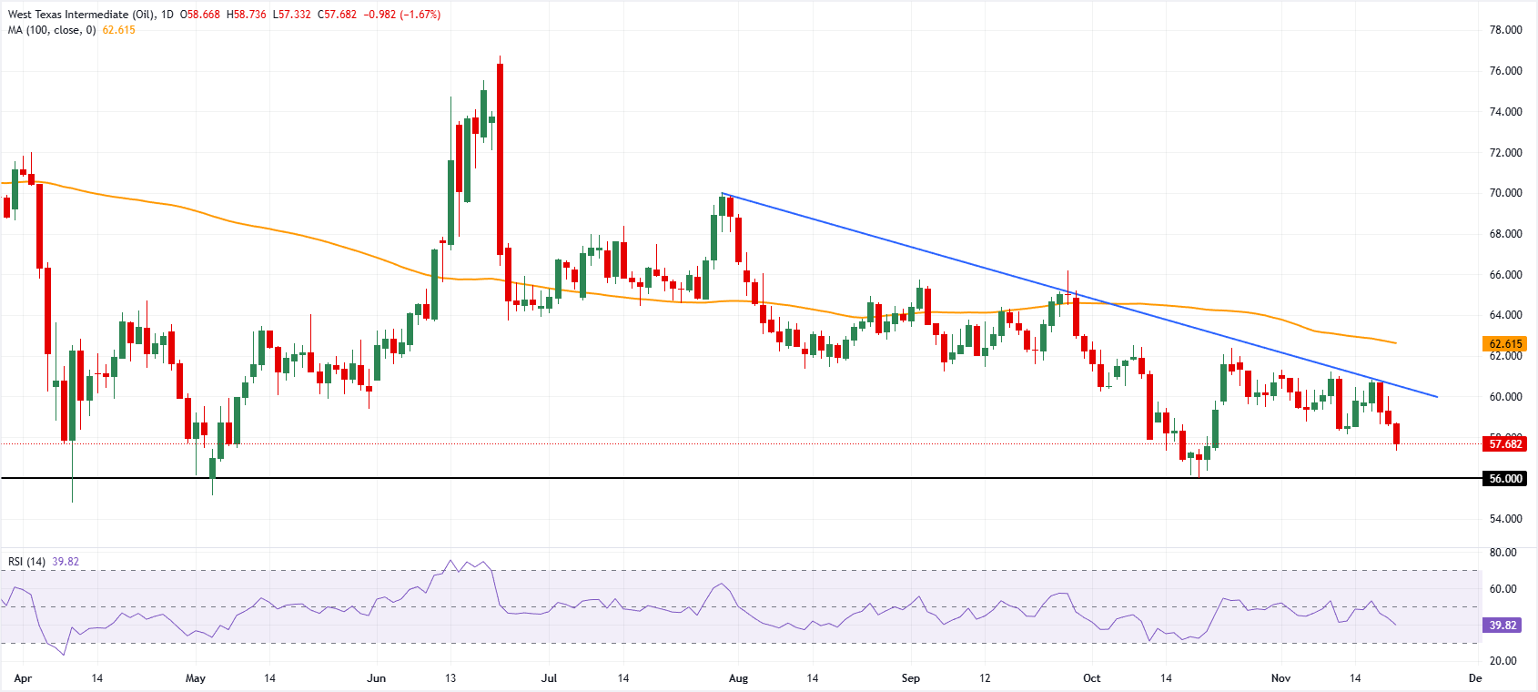 在撰写本文时,西德克萨斯中质原油(WTI)价格在周五约为 57.60 美元,日内下跌 1.90%。 标题:WTI 原油因乌克兰和平谈判和供应担忧跌至一个月低点