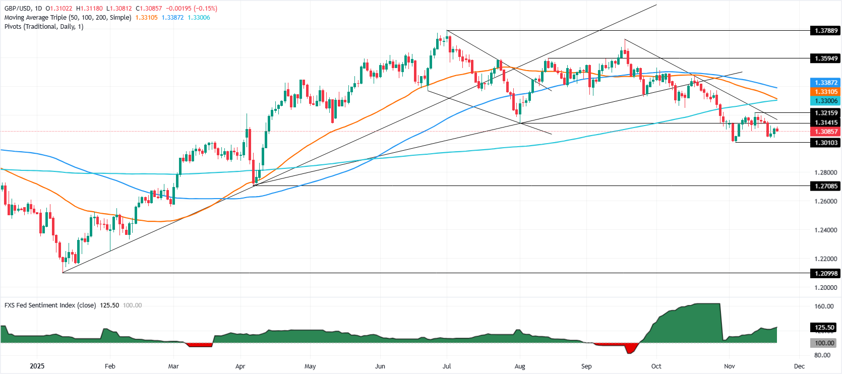 英镑/美元在周一北美时段保持低迷,交投于约1.3088,持平,交易者在等待英国预算的公布,因美国感恩节假期导致本周交易时间缩短 标题:英镑/美元在英国预算和美国数据激增前保持平稳,紧张局势上升