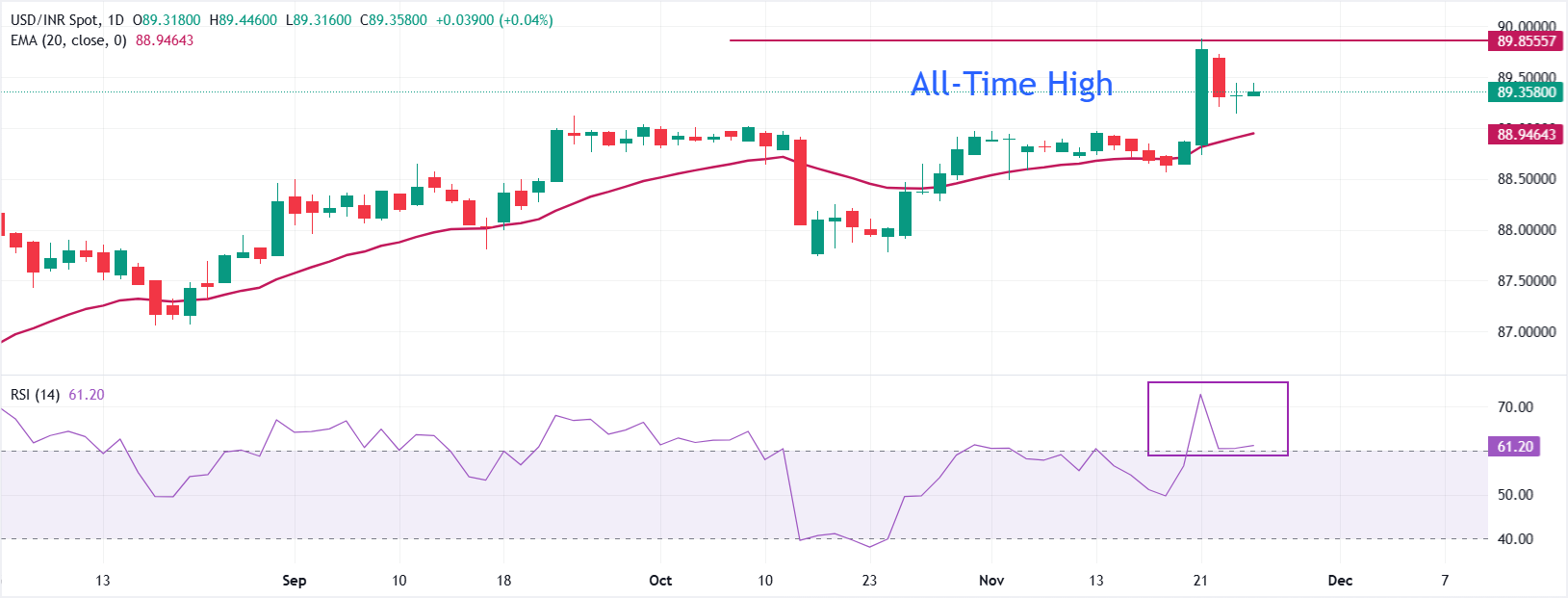 印度卢比(INR)在周三对美元(USD)开盘时小幅走低。美元/印度卢比(USD/INR)接近89.35,印度卢比继续表现不佳,因印度进口商和离岸市场对美元的持续需求。 标题:印度卢比在美国联邦储备委员会(美联储)鸽派押注增加的情况下,谨慎开盘对抗美元