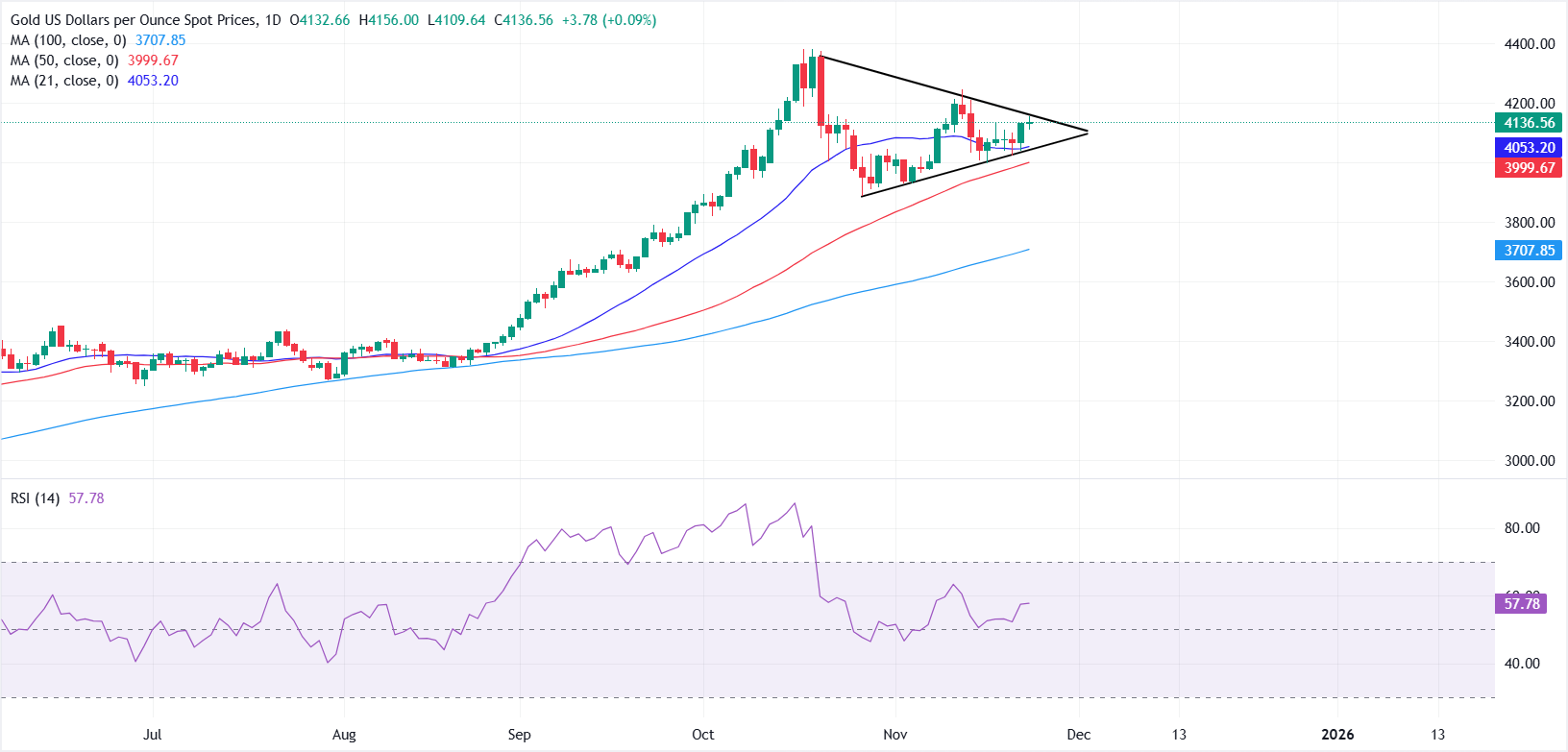 周二,黄金(黄金/美元)表现坚挺,因为交易商在美联储(Fed)决策者发表鸽派言论后,预计12月份降息的可能性更大。 标题:黄金保持稳定,鸽派美联储信号和疲软的美国数据提升降息押注