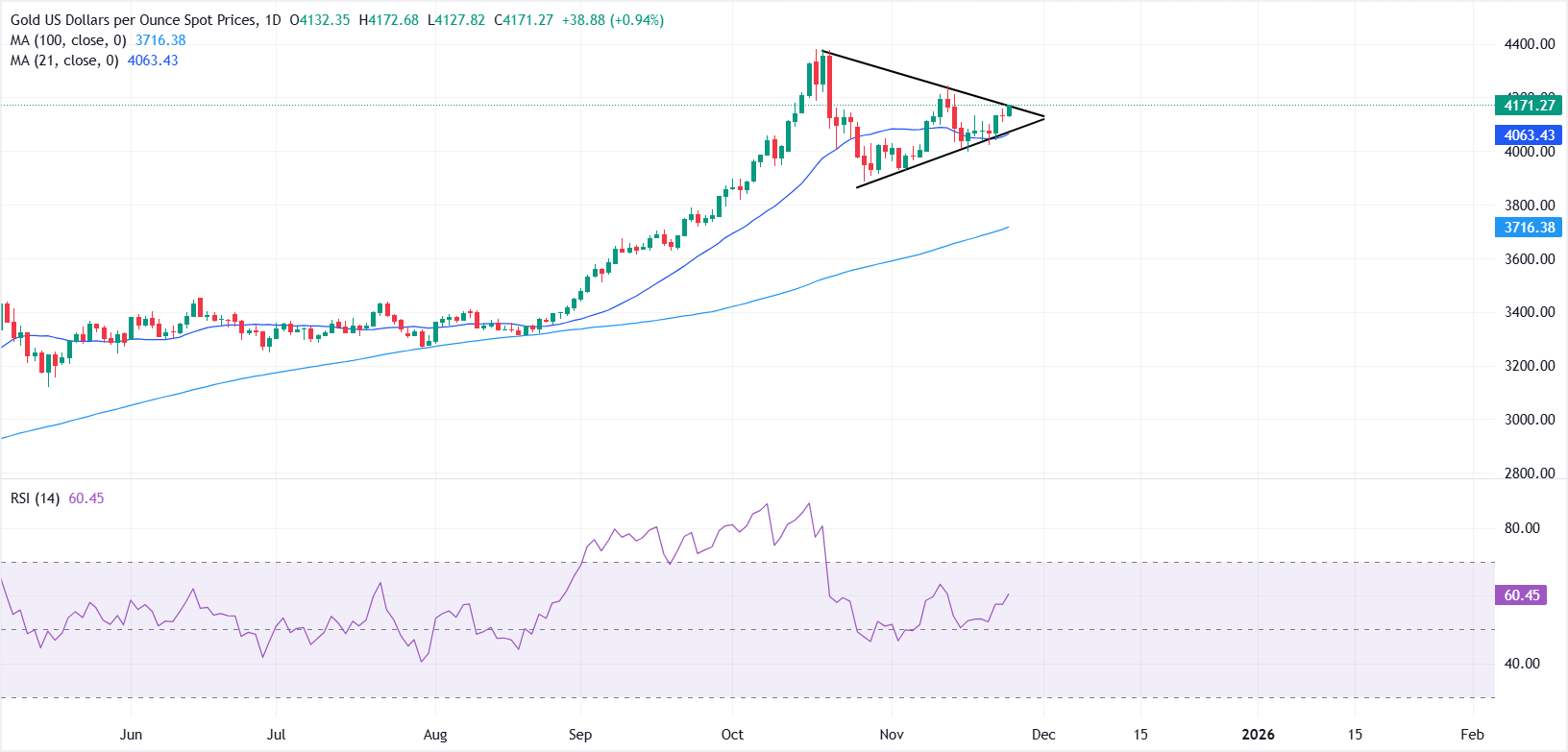 黄金(XAU/USD)在周三保持坚挺,交易者对美联储(Fed)更加鸽派的前景表示乐观,黄金/美元在约4150美元附近交易,稍微回落,此前在当天早些时候攀升至约4173美元的两周高点。 标题:金价在鸽派美联储预期中保持坚挺