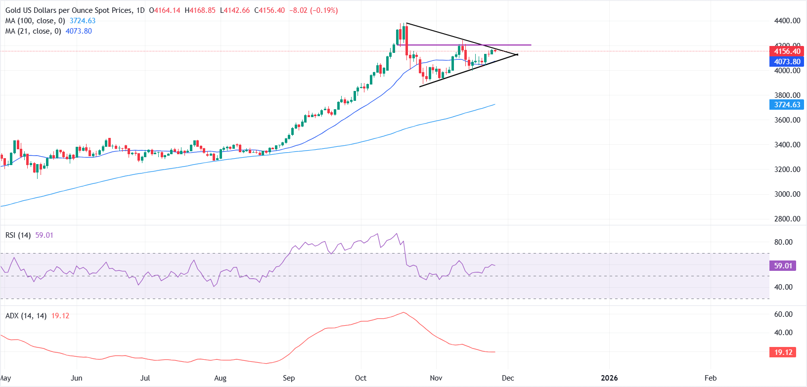 黄金(黄金/美元)周四走势平稳,因美元(USD)的温和反弹对该贵金属施加压力。撰写时,黄金/美元在4155美元附近交易,接近周三达到的两周高点,本周价格迄今上涨超过2% 标题:金价在假期交易稀薄的情况下横盘整理