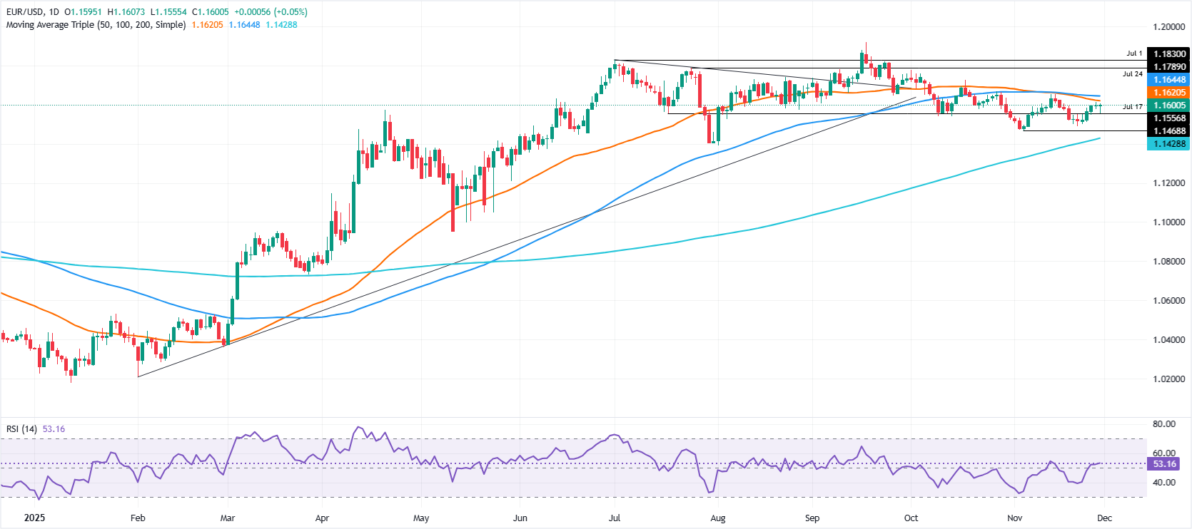 欧元/美元在周五北美时段保持稳定,预计将以0.81%和0.59%的涨幅结束本周和11月份,交易者似乎确信美联储将在12月份降息。 标题:欧元在1.1600上方保持坚挺,12月鸽派押注上升至87%