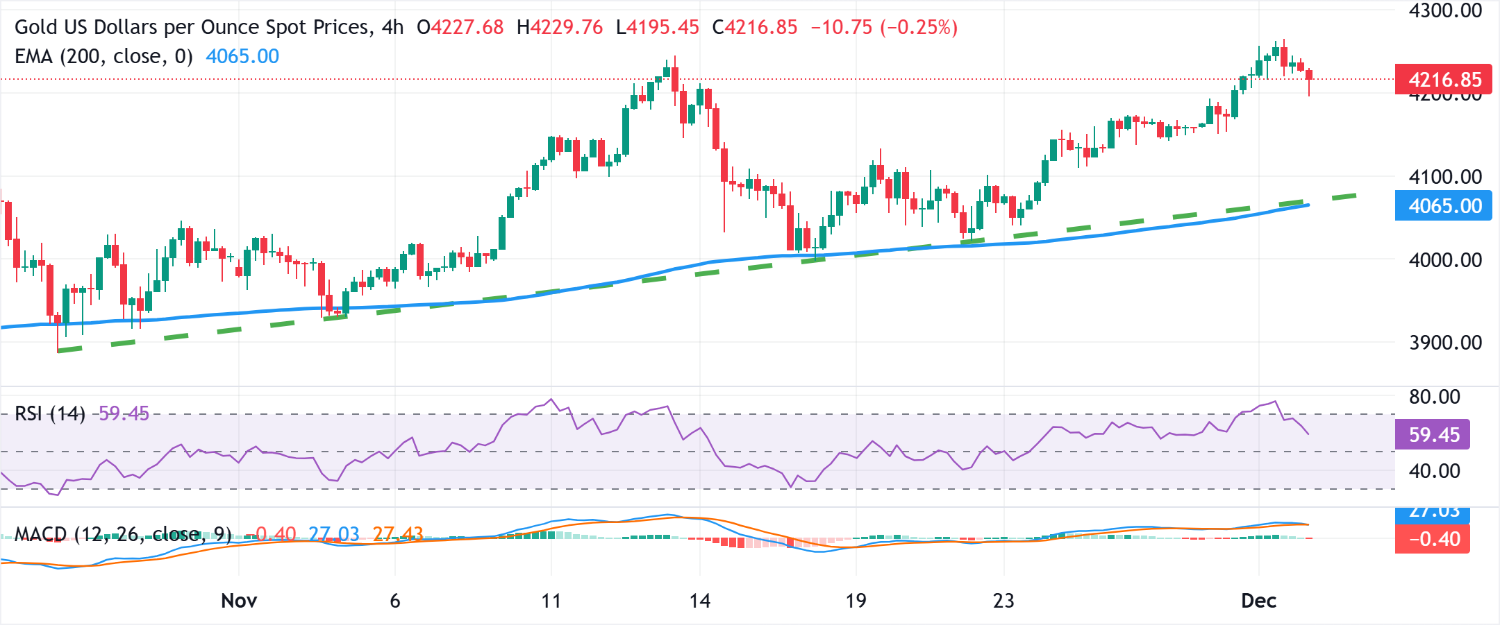 黄金(黄金/美元)扭转了亚洲时段跌至4200美元以下的走势,目前交投于略低于前一日触及的自10月20日以来最高水平,录得适度亏损 标题:黄金价格从4200美元以下反弹;在美联储降息预期中仍接近六周高点