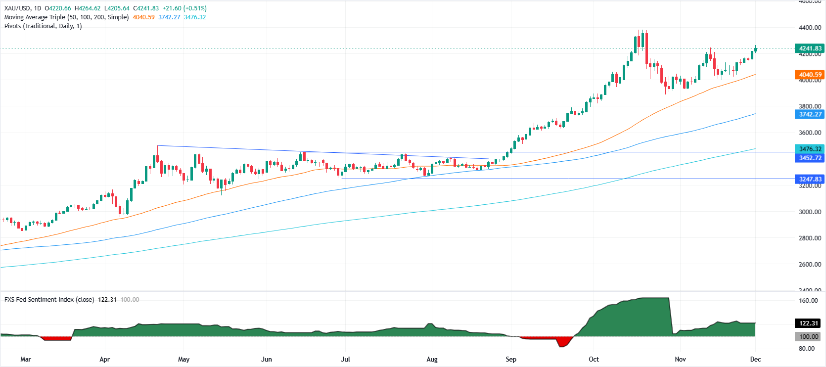 黄金(黄金/美元)在周一连续第二个交易日上涨,涨幅超过0.40%,因货币市场预计美联储(Fed)将在下周降息。 标题:金价因美联储降息狂潮而触及五周高点,逼近4264美元
