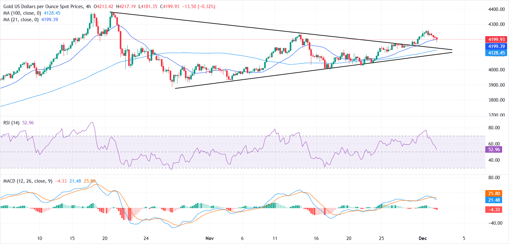 黄金(黄金/美元)周二小幅下跌,交易员在周一飙升至六周高点后锁定部分利润。截至发稿时,黄金/美元交易价格接近4190美元,日内下跌超过1%。 标题:尽管美联储鸽派预期,黄金仍难以找到买盘