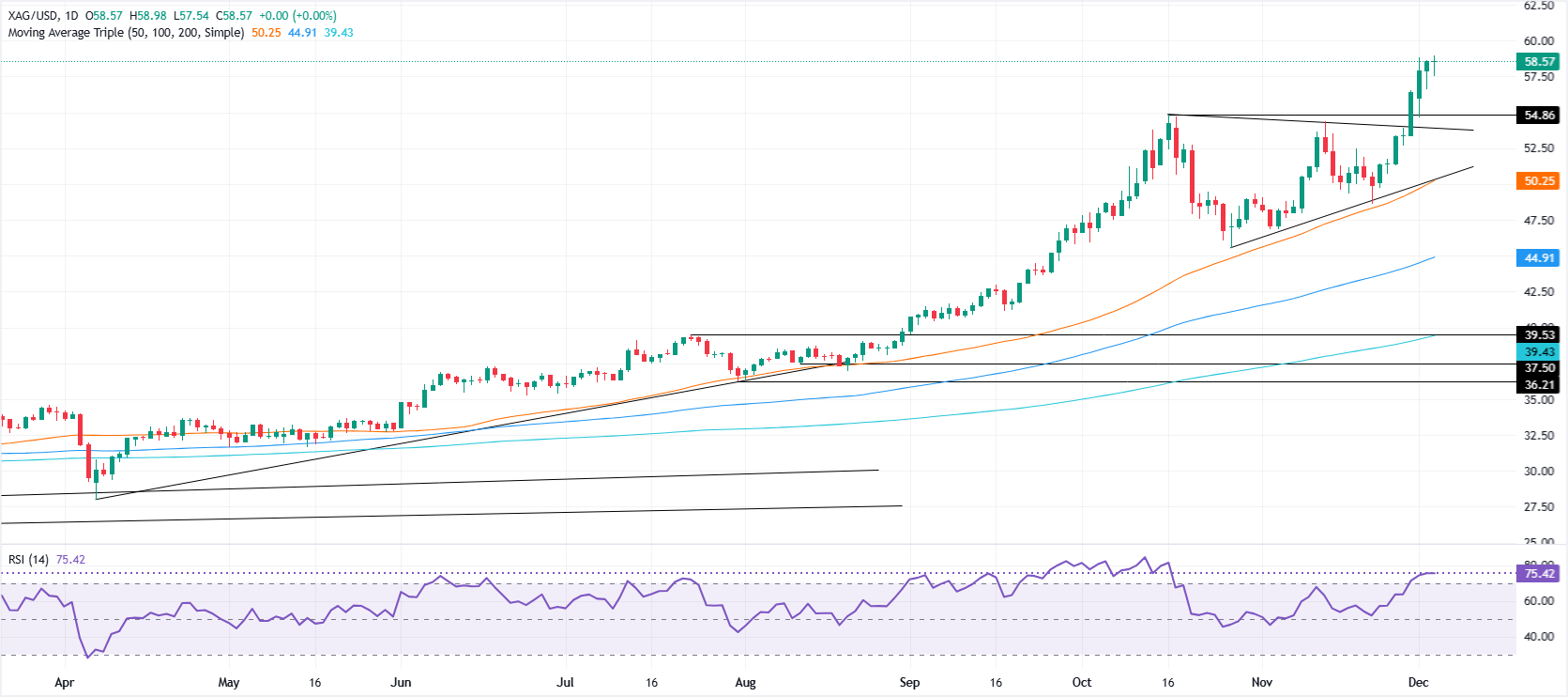 周三北美时段尾盘,银价回落,尽管美元走弱,但数据显示投资者意图美联储将在下周降息。截至发稿时,白银(XAG/USD)交易价格为58.49美元,跌幅为0.14% 标题:白银价格分析:上行趋势保持,RSI背离信号显示修正风险