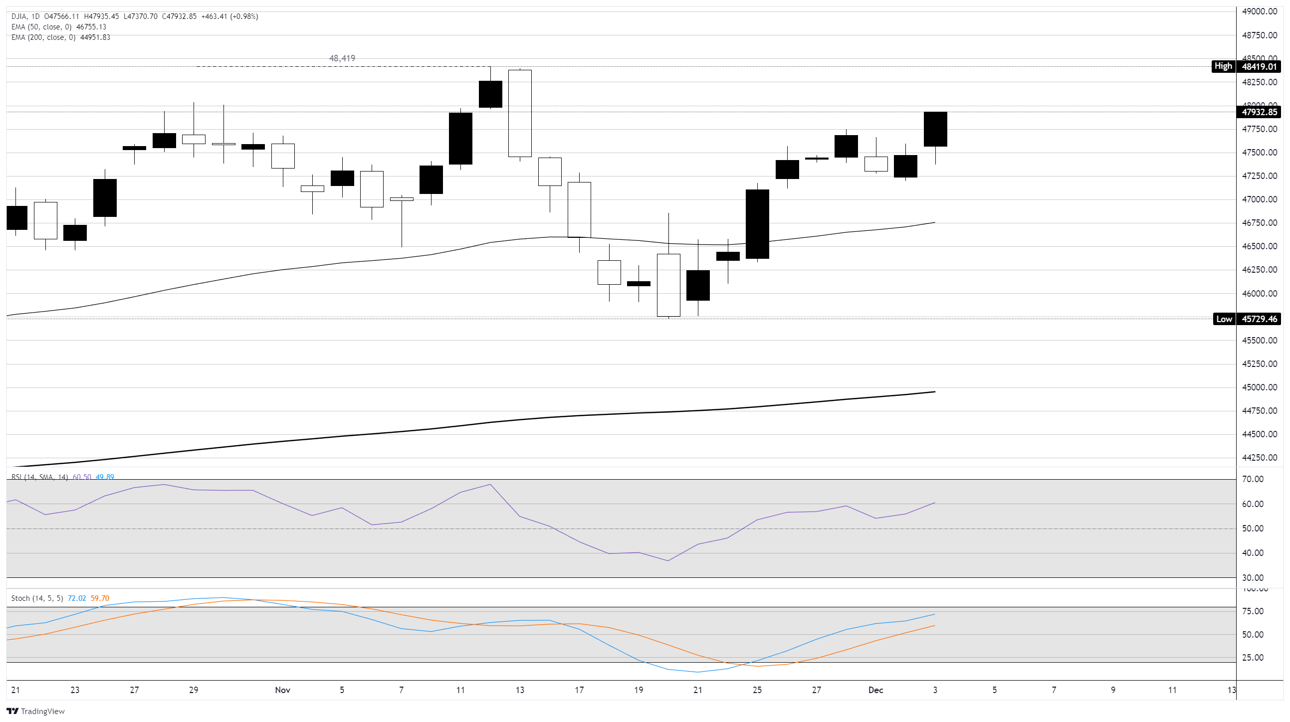 道琼斯工业平均指数(DJIA)周三上涨420点,市场对美国经济表现不佳的乐观情绪重新升温,推动美联储(Fed)被迫在12月进行第三次连续降息。 标题:道琼斯工业平均指数上涨420点,因降息预期上升