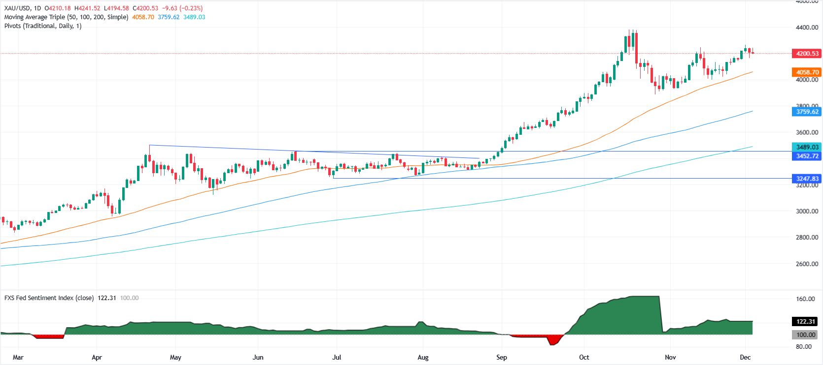 周三,黄金价格下跌约0.20%,尽管美国经济数据喜忧参半,但重申了交易商对下周美联储会议降息的预期。黄金/美元在触及日高4240美元后,交易价格在4200美元上方。 标题:在美元下滑和美联储转向预期增加的背景下,黄金价格徘徊在4200美元附近