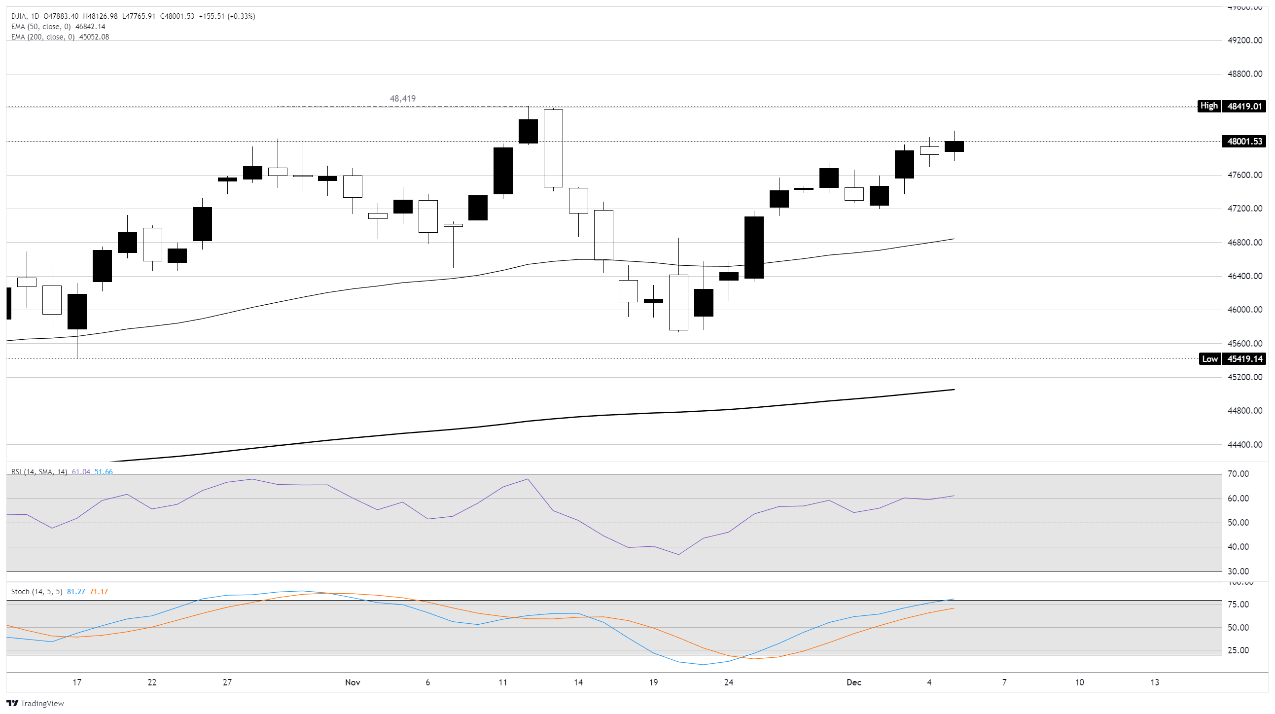 道琼斯工业平均指数(DJIA)周五小幅上涨,再涨150点,结束了接近48,000关口的适度看涨一周 标题:道琼斯工业平均指数小幅上涨,PCE 通胀降温,降息预期巩固