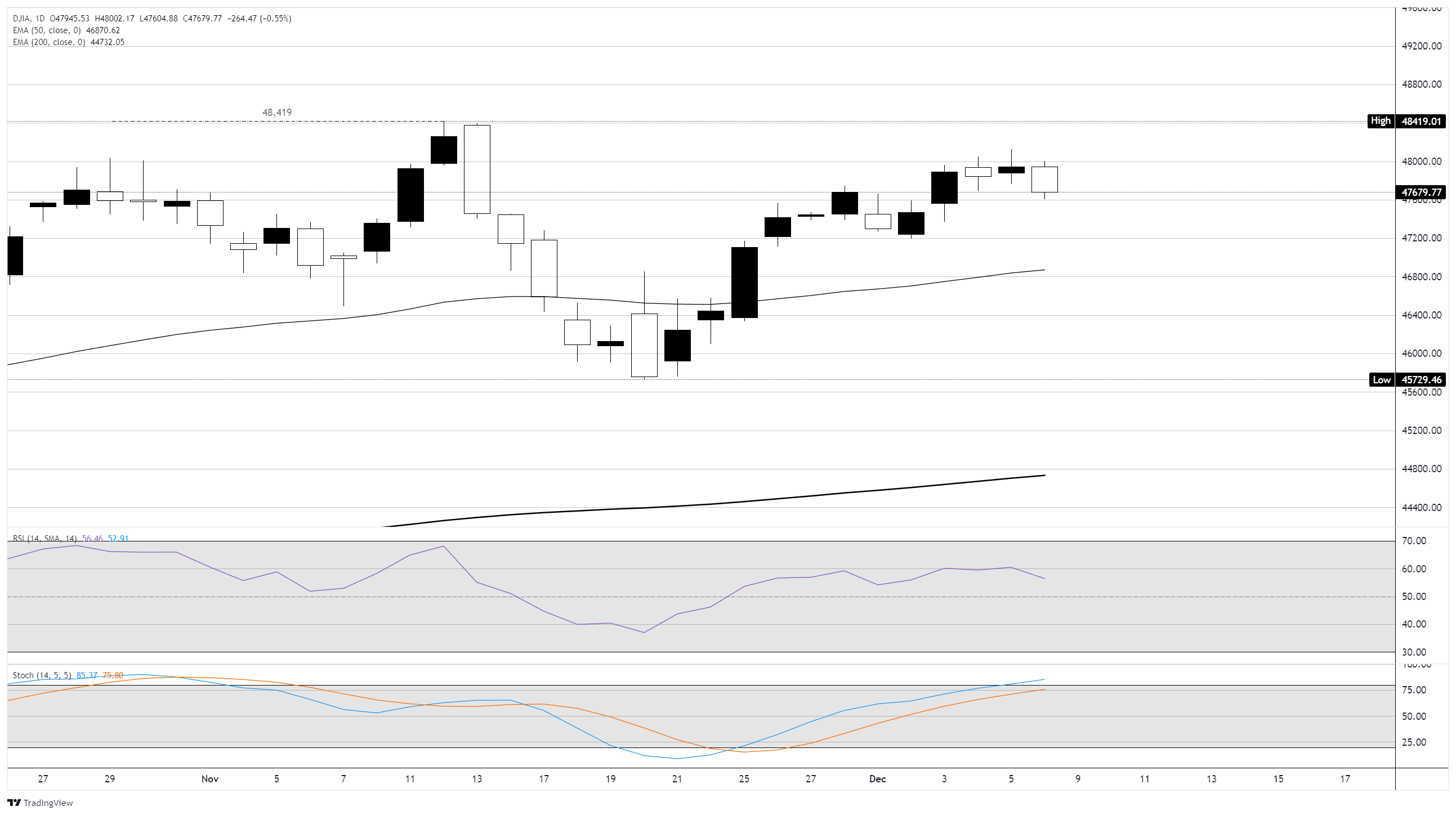 道琼斯工业平均指数在周一从48,000关口回落,因为投资者对美联储(Fed)即将降息的预期被10年期国债收益率的新一轮上升所压制 标题:道琼斯工业平均指数下跌200点,因国债收益率上升
