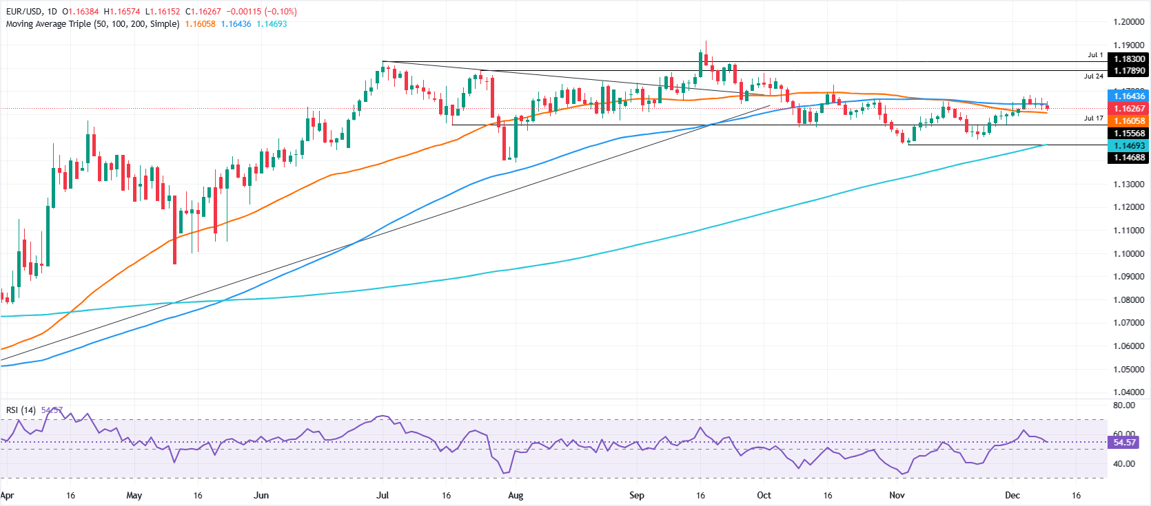 欧元/美元继续横盘交易,预计周二的交易以微幅下跌0.09%结束,因为市场参与者在等待美联储周三的货币政策决策。撰写时,该货币对交易于1.1626。 标题:欧元/美元保持稳定,市场为美联储决议和鲍威尔的指引做好准备