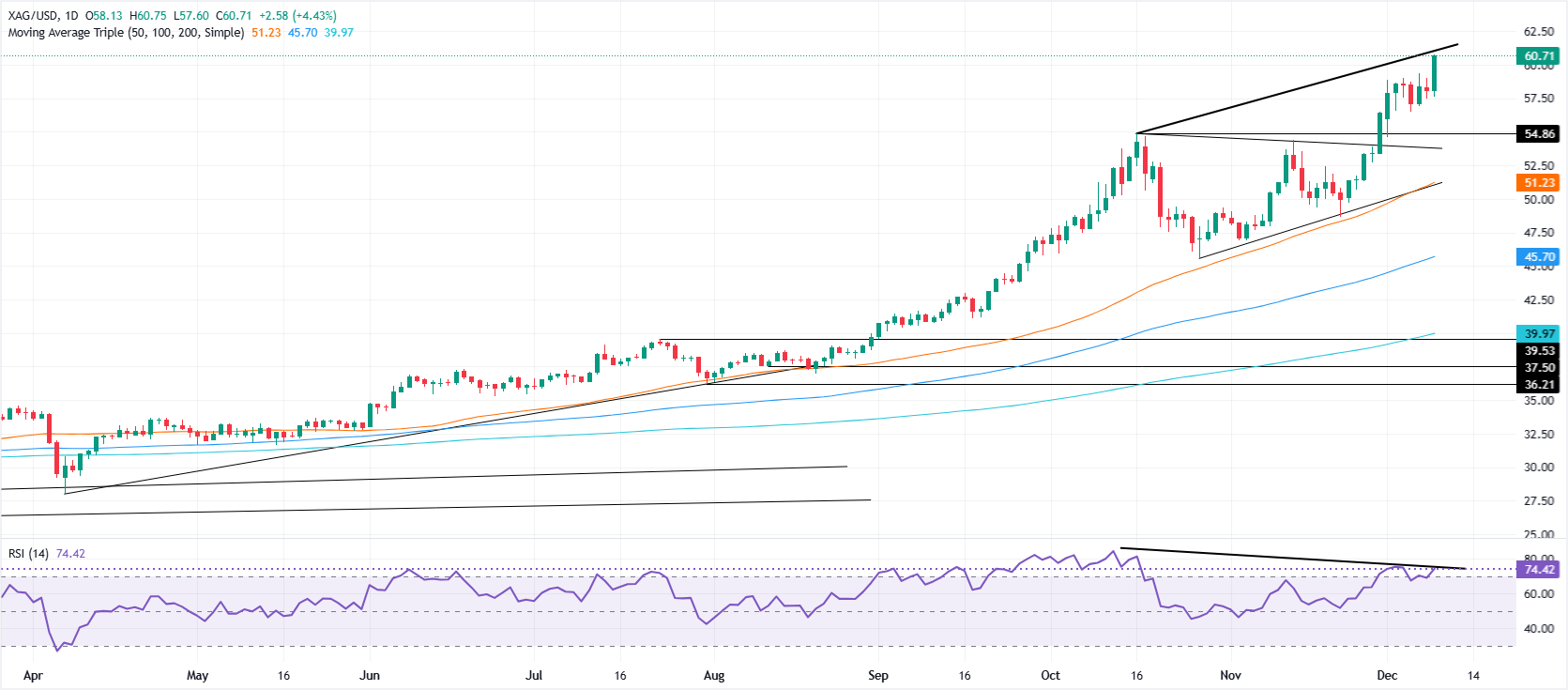 白银(XAG/USD)价格在周二延续涨势,刷新了早前创下的历史最高点 60.57 美元,日内上涨超过 4%,年初至今涨幅达到 110%。截至发稿时,XAG/USD 交易于 60.65 美元,曾触及 60.75 美元,这是该灰色金属的当前纪录高点。 标题:白银价格分析:创下历史新高,但RSI背离暗示需保持谨慎