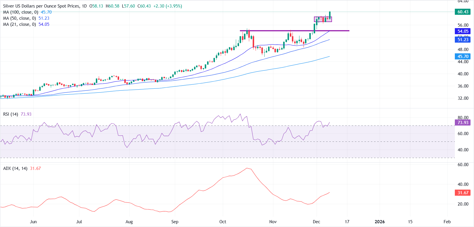 白银(XAG/USD)在周二延续历史性上涨,首次突破60美元大关,随着美联储(Fed)利率决策临近,看涨动能加速。 标题:白银首次突破60美元;技术面指向进一步上涨
