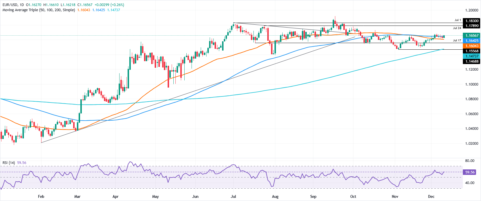 周三,欧元/美元上涨超过0.59%,因美联储如预期降息,这被视为“鸽派按兵不动”,促使交易者抛售美元,买入欧元。截至发稿时,该货币对交易接近日高1.1695,之前从日低1.1620反弹。 标题:欧元/美元因美联储鸽派降息而攀升至接近1.1700的8周高点