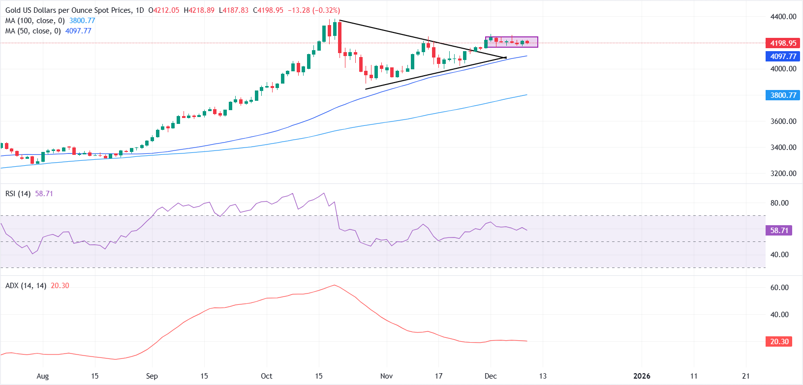 黄金(XAU/USD)在周三保持坚挺,价格走势维持在近期盘整区间内,市场为美联储(Fed)利率决策做好准备。截至发稿时,XAU/USD徘徊在4204美元附近,较日内高点4218美元有所回落 标题:金价在美联储裁决临近之际保持稳定