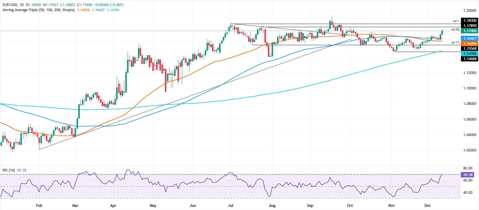 欧元/美元在周四北美时段上涨0.41%,因美联储决定降息,同时美国(US)发布的就业数据低于预期。撰写时,该货币对交易于1.1742,从日内低点1.1682反弹。 标题:欧元/美元在美元因美联储行动和疲软数据回落的情况下继续上涨