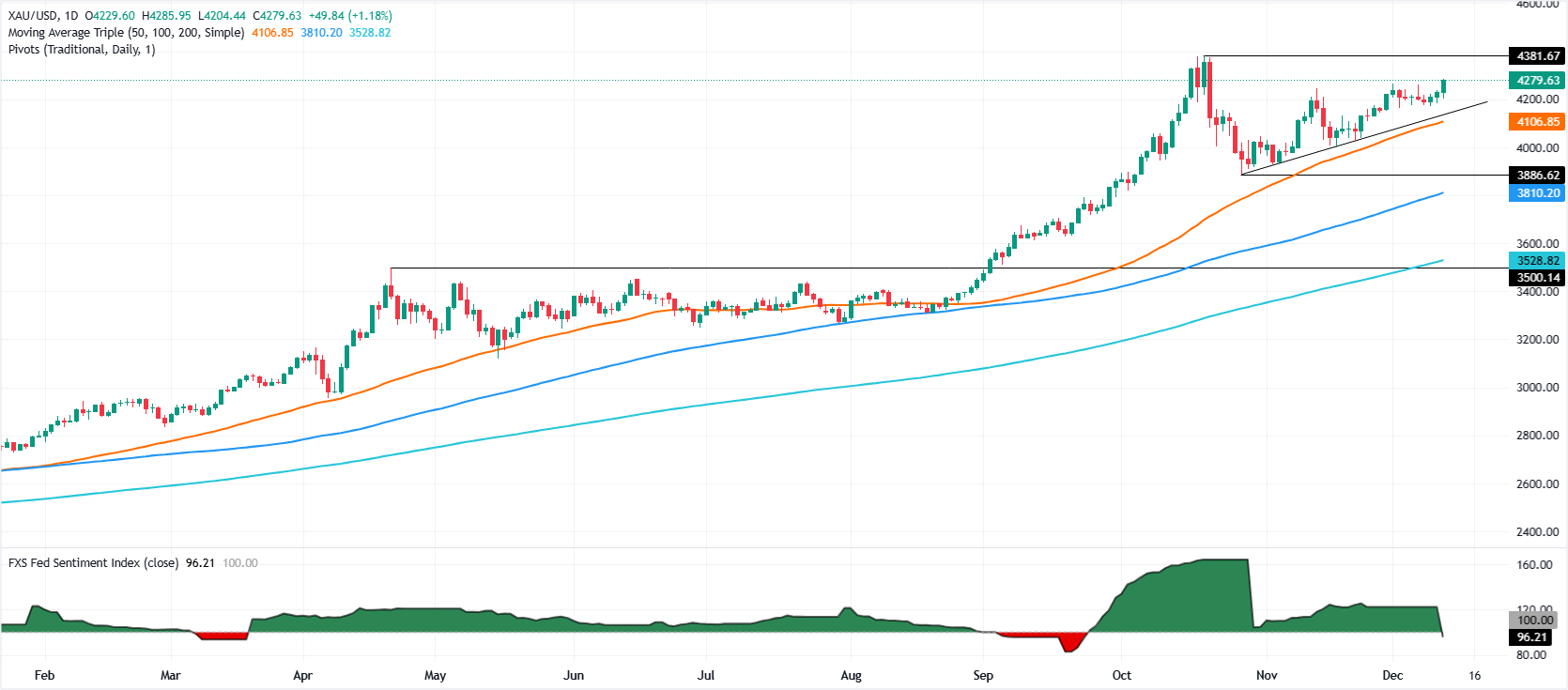 黄金(黄金/美元)在周四飙升,此前美联储(Fed)在周三如预期降息,尽管暗示放缓宽松周期,但这并未成为贵金属反弹的借口 标题:金价飙升至4270美元以上,因美联储降息引发黄金突破