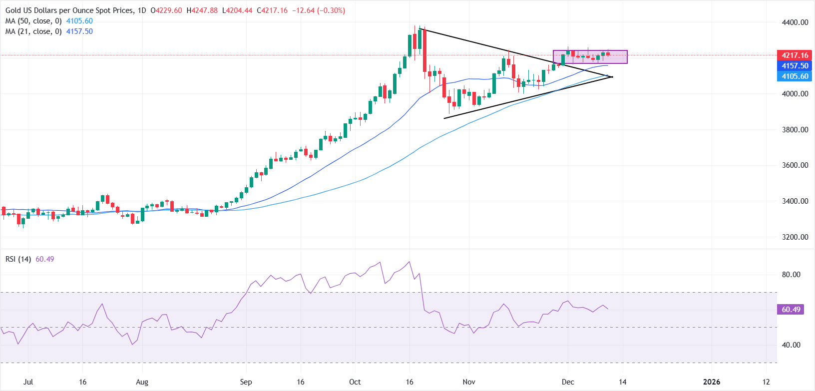 黄金(黄金/美元)在周四重新获得支撑,部分收复早前的跌幅,因为美元(USD)普遍走弱。在撰写本文时,金属交易价格约为4235美元,投资者在最新的降息后重新评估美联储(Fed)的货币政策前景。 标题:黄金保持稳定,疲软的美元限制了下行空间