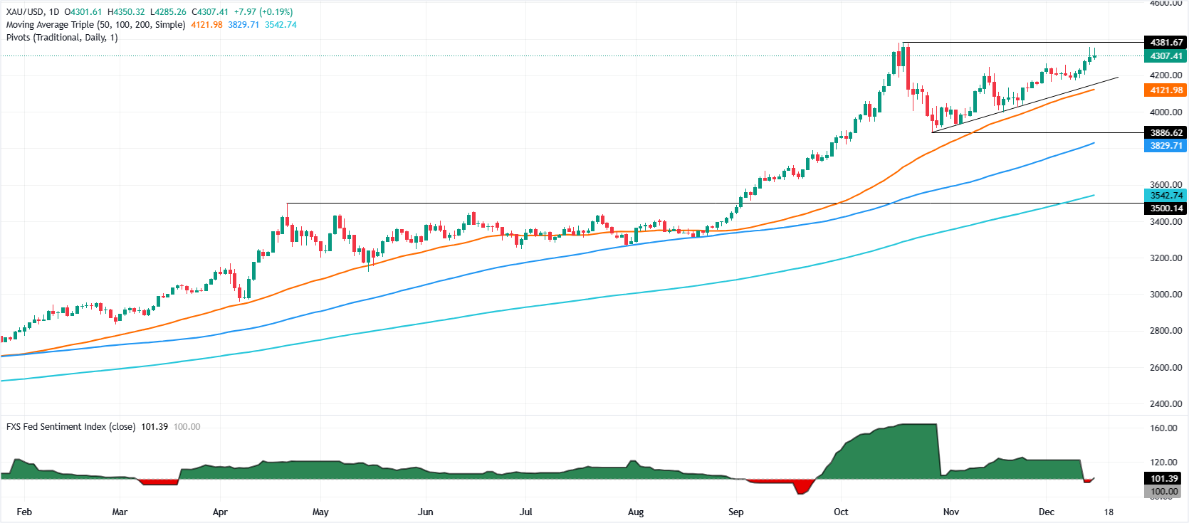黄金(XAU/USD)在周一保持坚挺,此前触及日高 $4,350,但交易者获利了结使得黄金回吐早前涨幅,美元继续走弱。黄金/美元目前交投于 $4,296,几乎没有变化。 标题:金价持稳,交易者权衡美联储立场和即将公布的数据