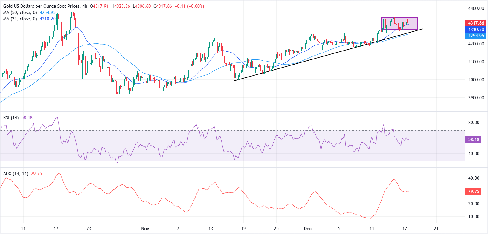 黄金(黄金/美元)在周三早盘下跌后反弹,尽管美元(USD)走强继续限制上涨动能。截至撰写时,黄金/美元交易在4,335美元附近,日内上涨近0.70%。 标题:黄金交易带有积极偏向,因为鸽派美联储前景抵消了更强的美元