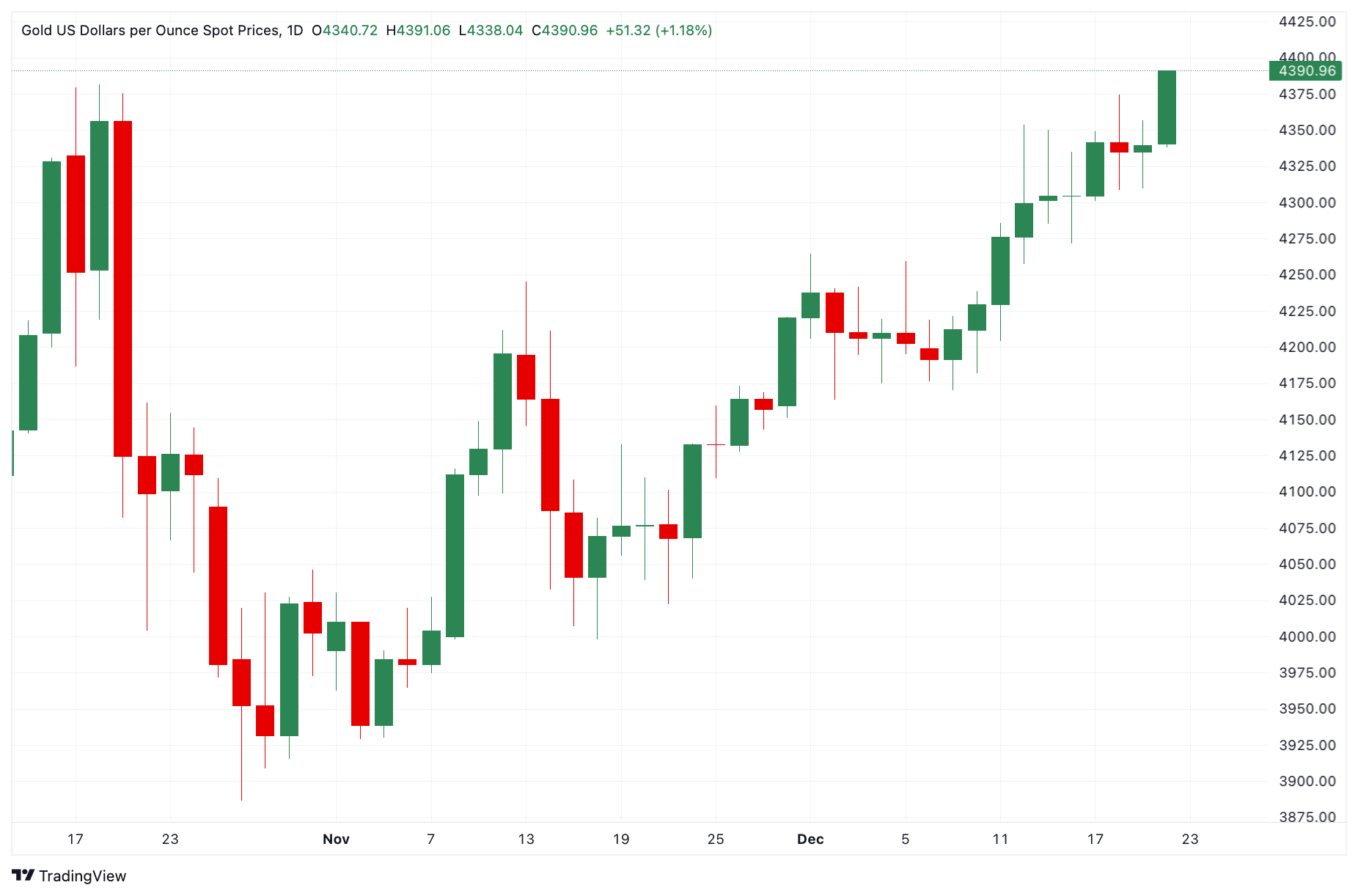 黄金价格(黄金/美元)在周一早盘欧洲交易时段上涨至接近4300美元的历史高位。由于美国通胀放缓和就业报告降温的迹象,贵金属在市场对美联储(Fed)降息的预期下获得了动能 标题:黄金因避险资金流入攀升至近4400美元的历史高位