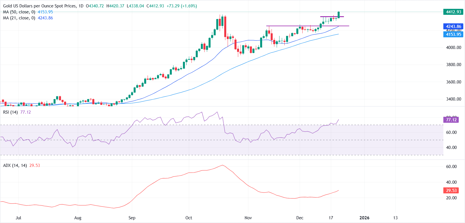 黄金(XAU/USD)周一飙升至新高,因不断升级的地缘政治紧张局势提振了避险需求。在撰写本文时,黄金/美元交投于约4424美元,日内上涨约2%,突破了10月20日接近4381美元的高点 标题:黄金突破4400美元,地缘政治紧张局势和美联储前景提振需求