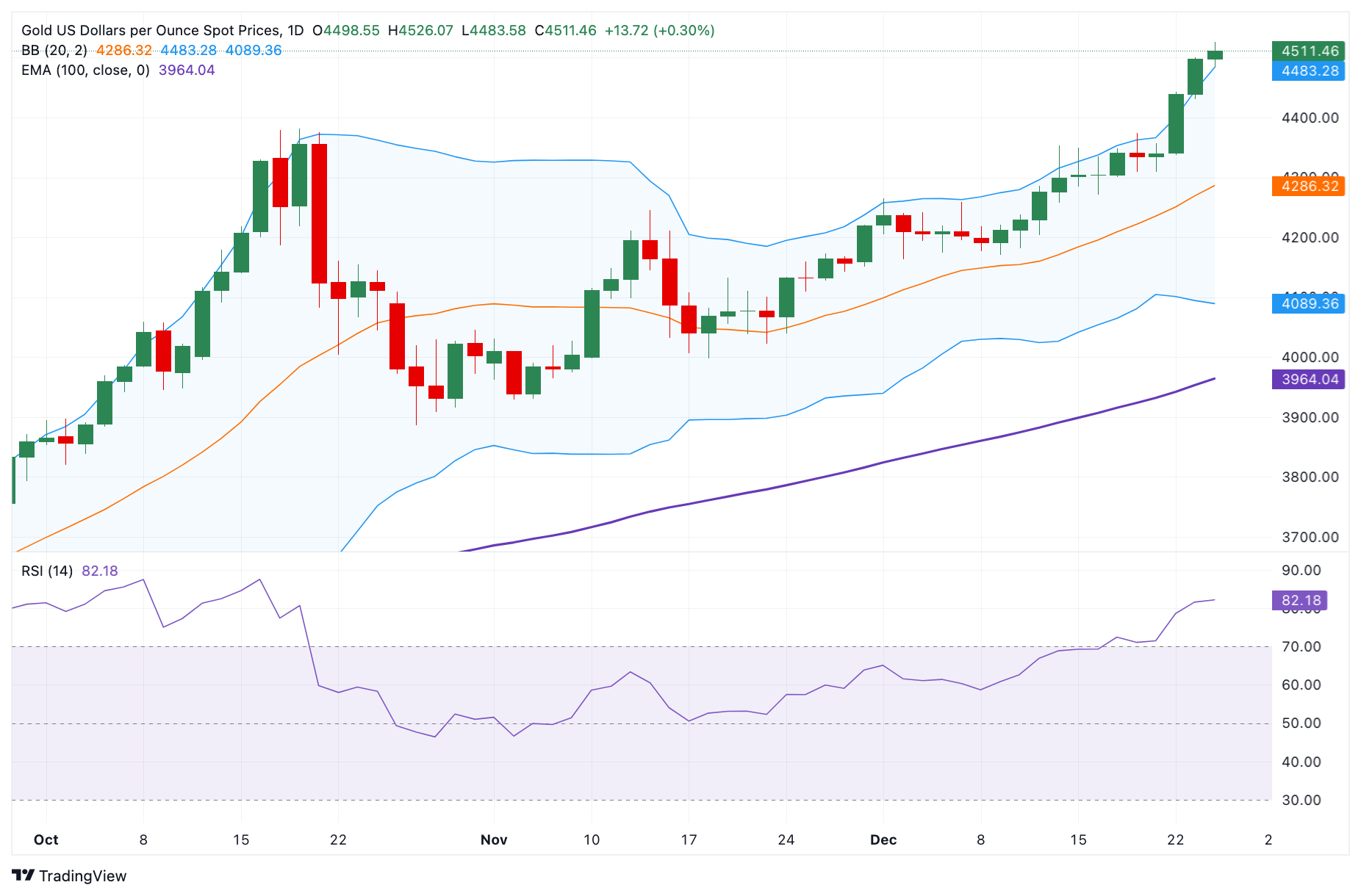 周三亚洲交易时段,金价(黄金/美元)延续反弹,创下超过4520美元的新纪录。由于美国与委内瑞拉冲突等持续的地缘政治不确定性,避险需求持续高企,推动该贵金属上涨。 标题:黄金因委内瑞拉紧张局势和美联储降息乐观情绪小幅上涨至历史新高