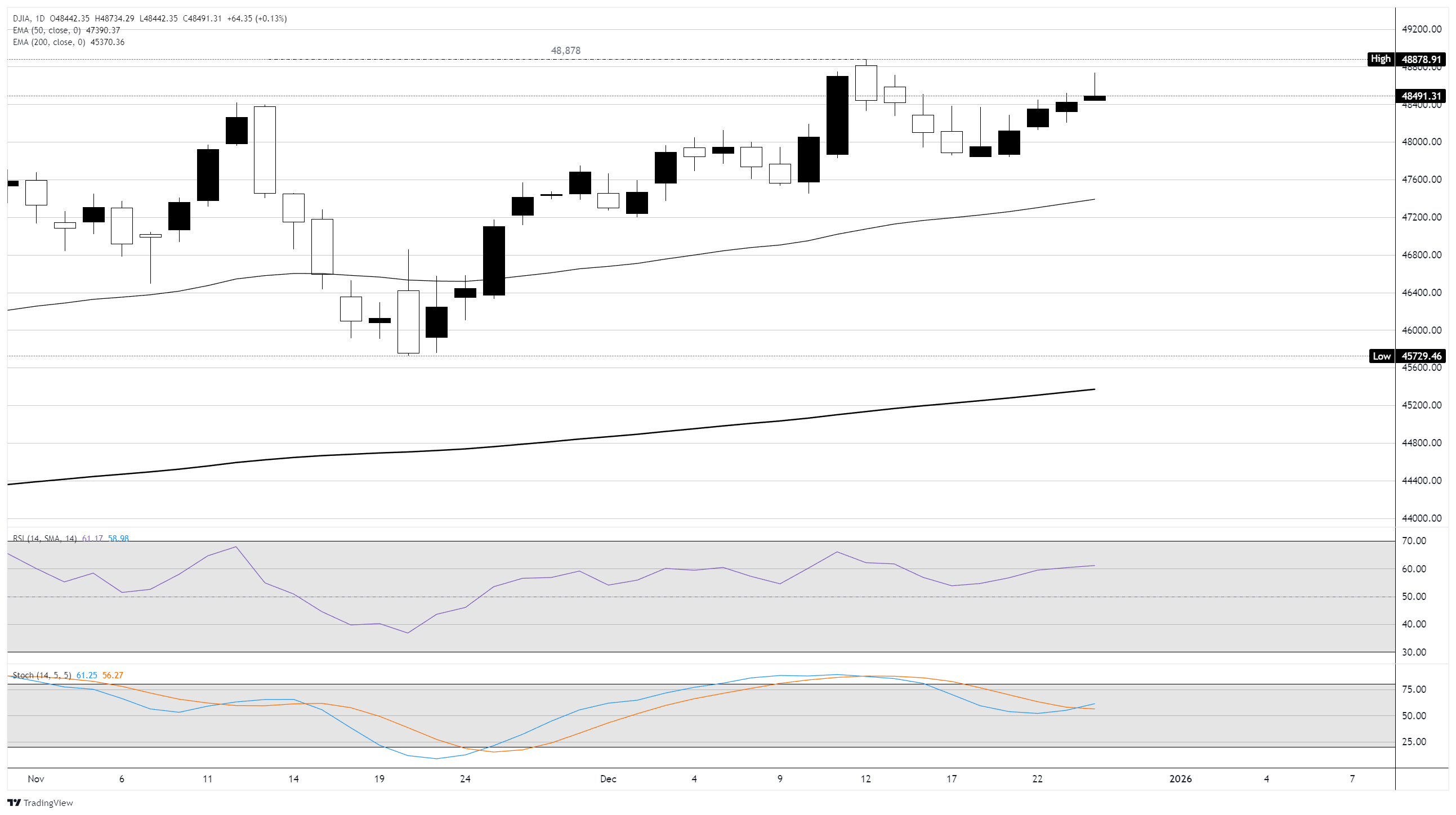 尽管接近创纪录高点,美国股市在2025年最后一个交易周的开局略显平淡 标题:道琼斯工业平均指数因人工智能股票的压力而停滞,市场关注美联储会议纪要