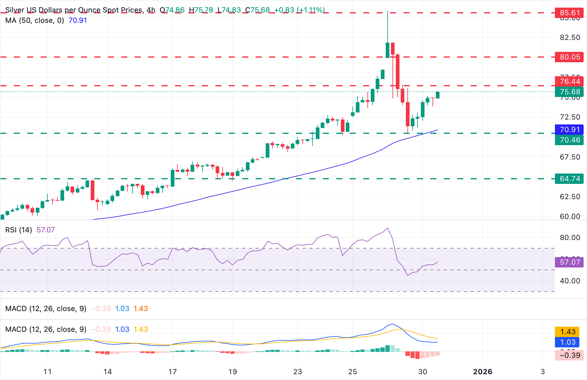 白银(XAG/USD)在周二削减了损失,此前在周一流动性稀缺的情况下贬值超过7%。 标题:白银价格预测:白银/美元在地缘政治紧张局势中上涨至75.00美元