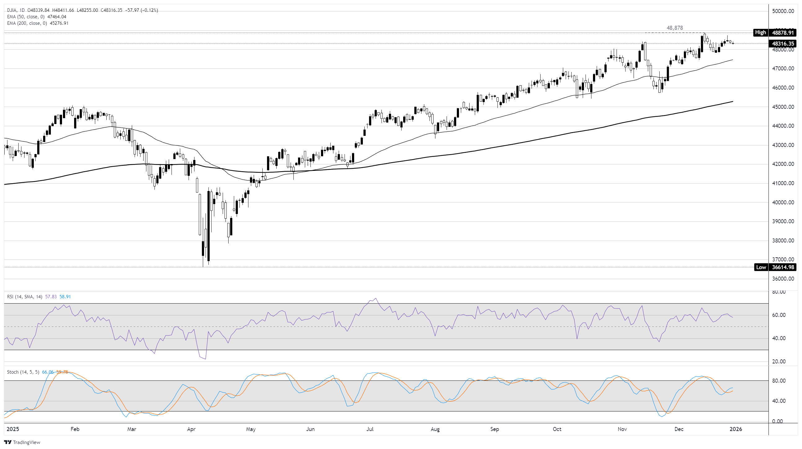 美国股市在周中小幅回调,但对投资者而言,整体形势依然是一个强劲的年度即将结束。标普500指数周三下跌约0.2%,与纳斯达克综合指数的跌幅相匹配,而道琼斯工业平均指数则下跌约0.5% 标题:道琼斯工业平均指数在2025年最后一个交易日走软