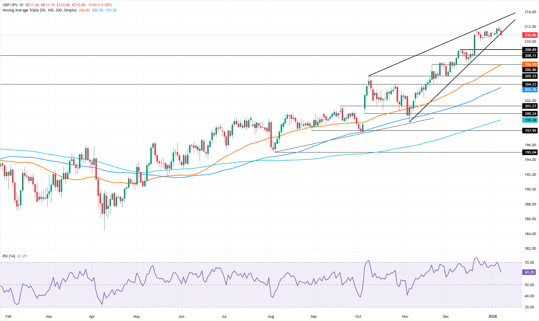 英镑/日元周三连续第二天下跌,在周二触及年内高位 212.16 后,跌破 211.00,录得 0.27% 的跌幅。随着周四亚洲时段的开始,该货币对交投于 210.85,持平。 标题:英镑/日元价格分析:回落至211下方,动能转向看跌