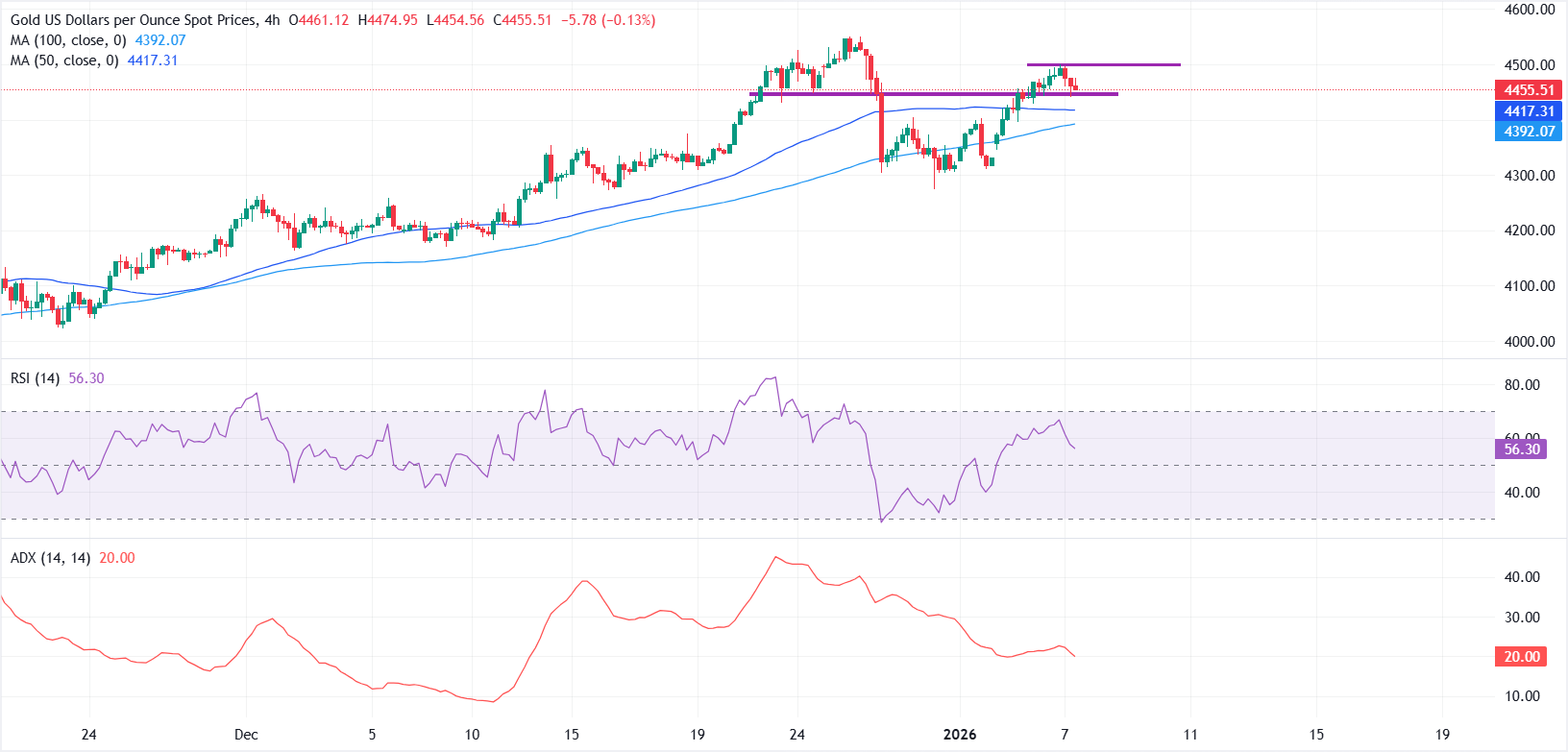 黄金(黄金/美元)周三走势疲软,因在4500美元的心理关口附近出现卖压,导致高位出现轻微的获利了结。 标题:金价走弱,因为乐观的美国服务业采购经理人指数(PMI)抵消了疲软的劳动力信号