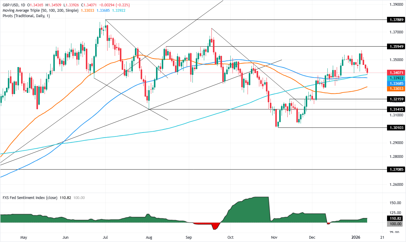 英镑(GBP)在周五回落,此前12月份的非农就业报告数据喜忧参半,尽管交易者降低了对1月份降息的押注。截至发稿时,英镑/美元交投于1.3412,曾触及1.3451的高点 标题:英镑/美元跌破1.3450,非农就业数据削减1月美联储降息押注