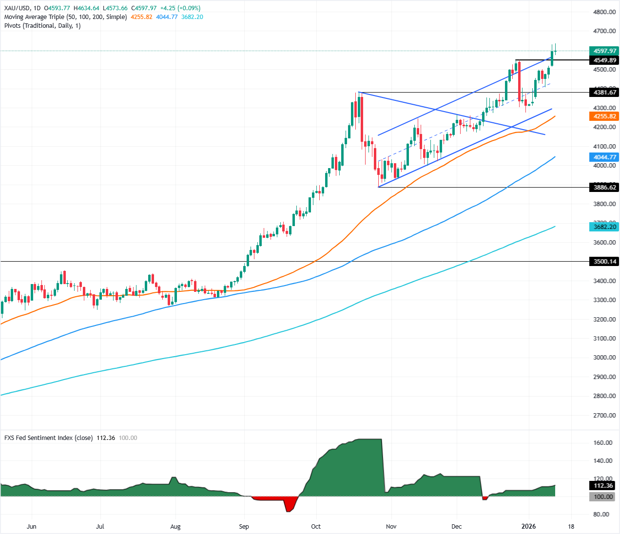 黄金(XAU/USD)在周二小幅回落,此前美国12月份的通胀数据发布,确认价格保持稳定,表明美联储可能会进一步降息。XAU/USD交易于4590美元,下降0.15%,在当天早些时候短暂触及4634美元的历史高点。 标题:黄金价格跌破4600美元,因美国消费者物价指数降温,美元限制了涨幅