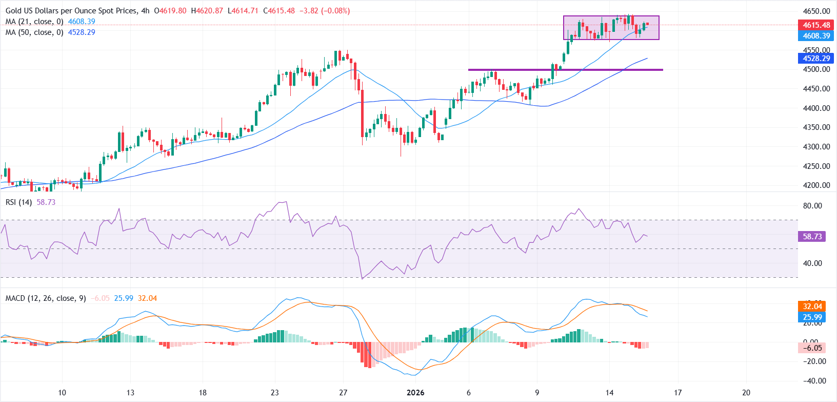 黄金(黄金/美元)周四走势略显负面,因交易者在周三飙升至接近 4,643 美元的历史新高后获利了结。截至撰写时,黄金/美元在 4,586 美元附近交易,日内下跌近 1% 标题:金价因获利了结和美元走强而从历史高位回落