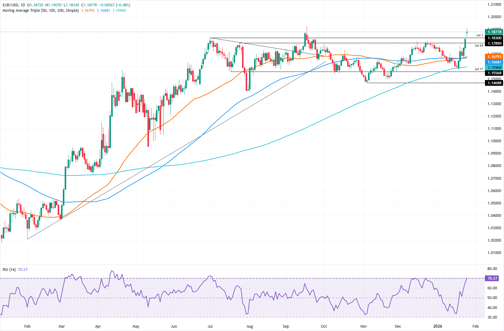 周一,欧元上涨超过0.39%,因美元走弱,此前美国地缘政治紧张局势引发的抛售以及对美国和日本在外汇市场进行协调干预的猜测。欧元/美元交易于1.1872,反弹自日内低点1.1835。 标题:欧元/美元攀升至1.1870,因美元因地缘政治紧张局势而下跌