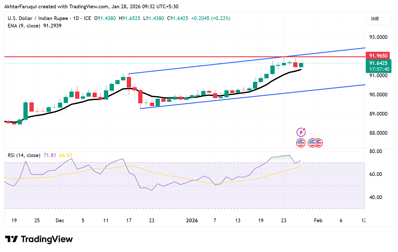美元/印度卢比小幅走高,此前在上一交易日录得0.25%的跌幅。该货币对反弹至其历史高点91.96,达到该水平的时间为1月23日,因美元在美联储(Fed)政策决策前的谨慎情绪中走强。 标题:美元/印度卢比上涨,因美联储谨慎展望推动美元走强