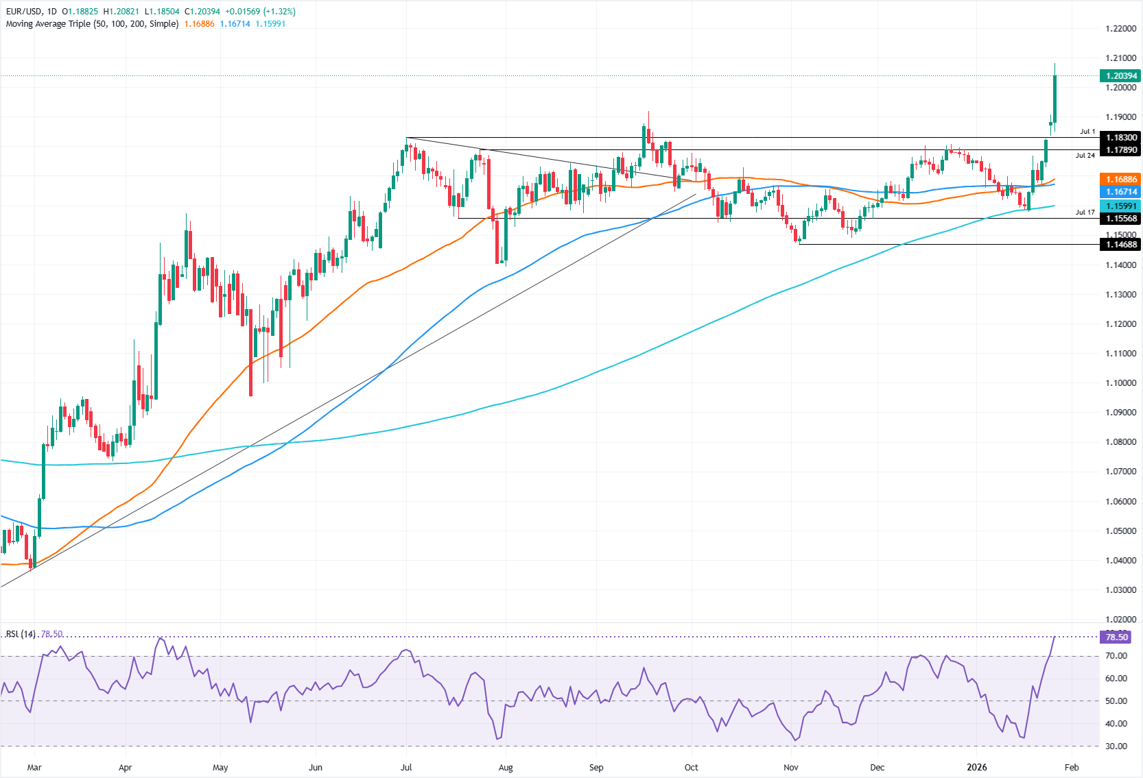 欧元/美元在周二飙升至五年新高1.2082,此前美国总统唐纳德-特朗普表示他认为美元没有下跌太多,导致美元大幅抛售,日内跌幅超过1.31% 标题:欧元/美元突破1.2080,创五年新高,特朗普对美元表示不屑