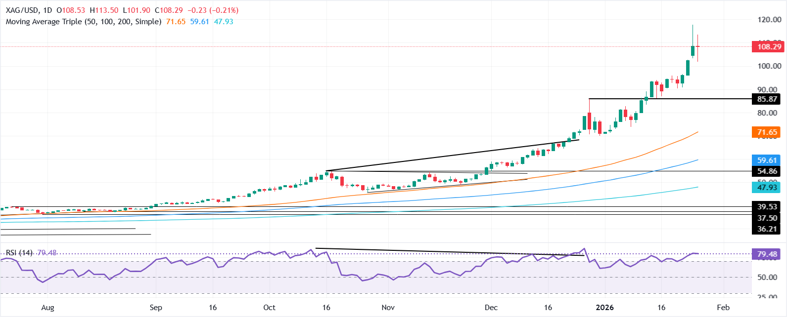 周二,银价波动剧烈,此前在周一因地缘政治紧张局势加剧以及美国与其盟友的贸易战而延续了涨势,重新点燃了“抛售美国”的交易。白银/美元在触及日低103.00美元后反弹至108.00美元, modestly上涨0.05% 标题:白银价格预测:白银/美元跃升至108美元以上,贸易战推动“卖出美国”资金流动