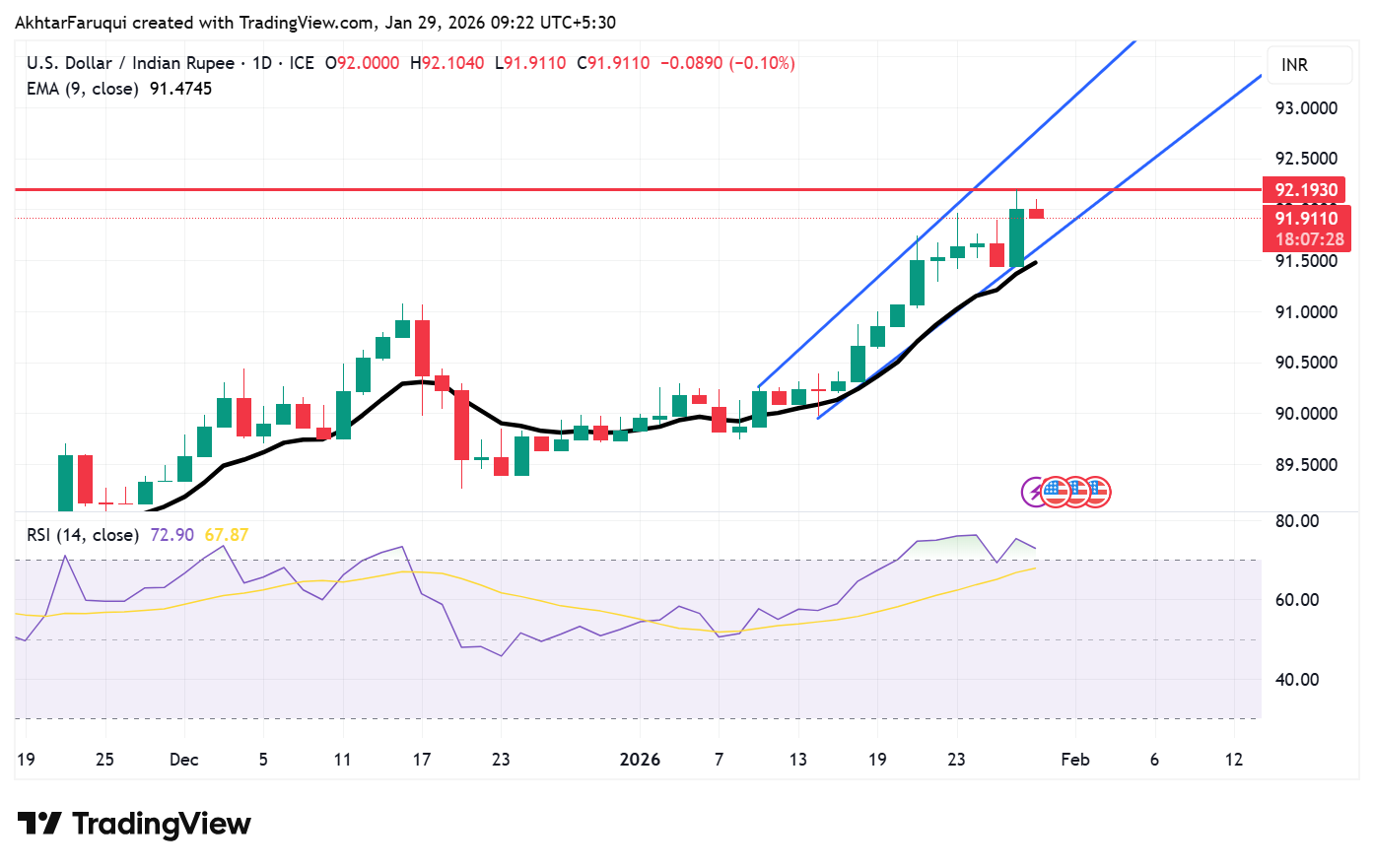 美元/印度卢比在前一交易日录得超过0.5%的涨幅后贬值。印度卢比(INR)在市场对印度储备银行(RBI)干预的猜测中走强,旨在遏制损失,因为该货币对在1月28日触及92.19的历史新高。 标题:印度卢比上涨,因交易员预计印度储备银行将进行干预