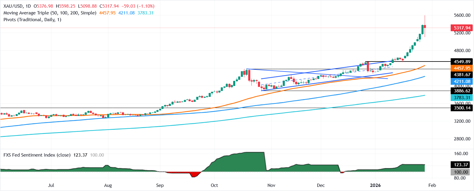黄金(XAU/USD)在周四削减了早些时候的部分跌幅,因为交易商在美联储(Fed)货币政策决定后获利了结,该决定几乎没有影响市场,黄金似乎有望录得自1980年代以来的最佳月份。 标题:黄金削减损失,接近5600美元,准备迎接数十年来最强劲的月份