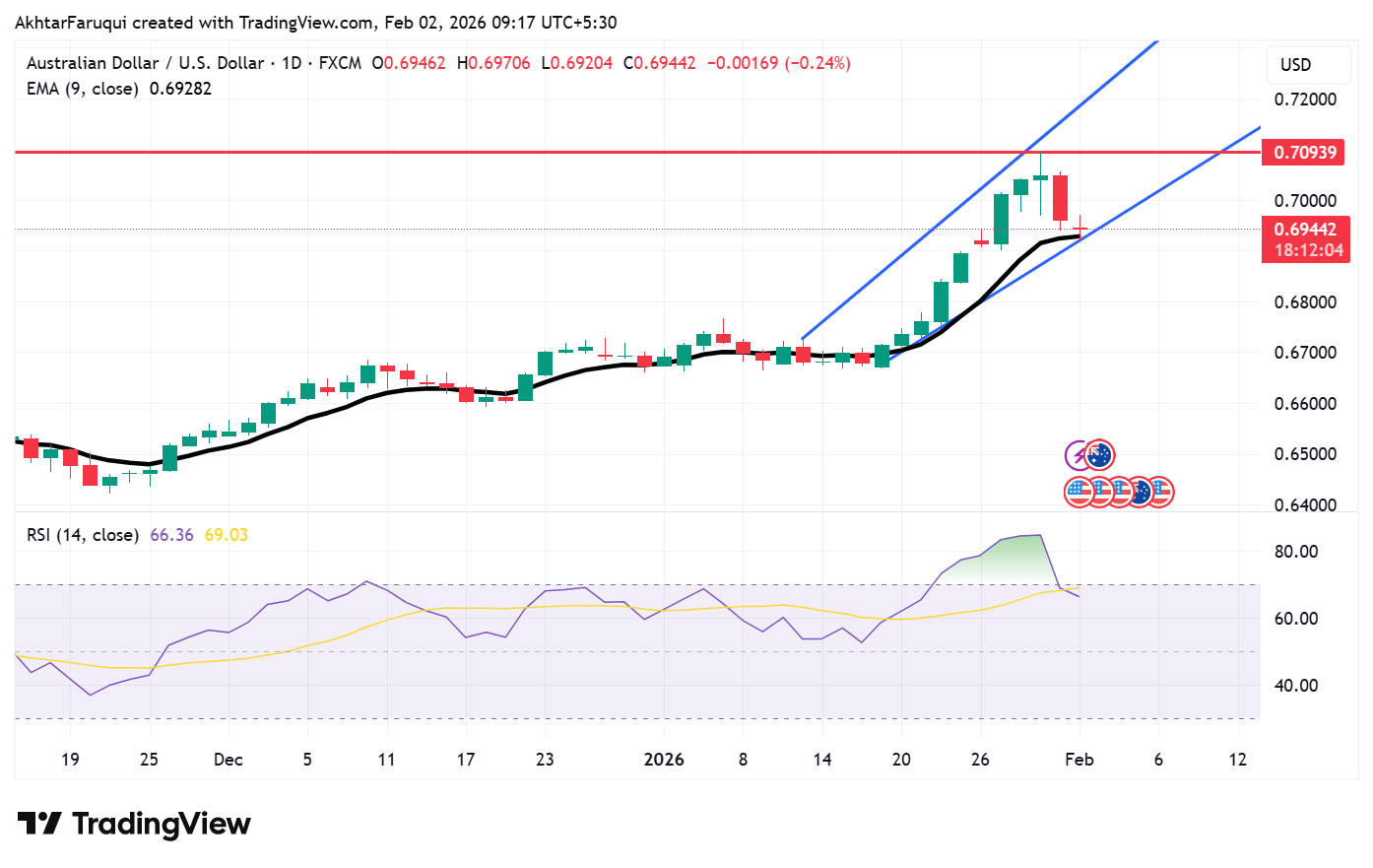 周一,澳大利亚元(AUD)兑美元(USD)走弱,此前在上一交易日录得超过1%的跌幅。澳元/美元货币对在中国RatingDog制造业采购经理人指数(PMI)数据公布后保持低迷,该指数从12月份的50.1上升至1月份的50.3。 标题:澳元进一步下跌,尽管中国的评级狗(RatingDog)PMI增长